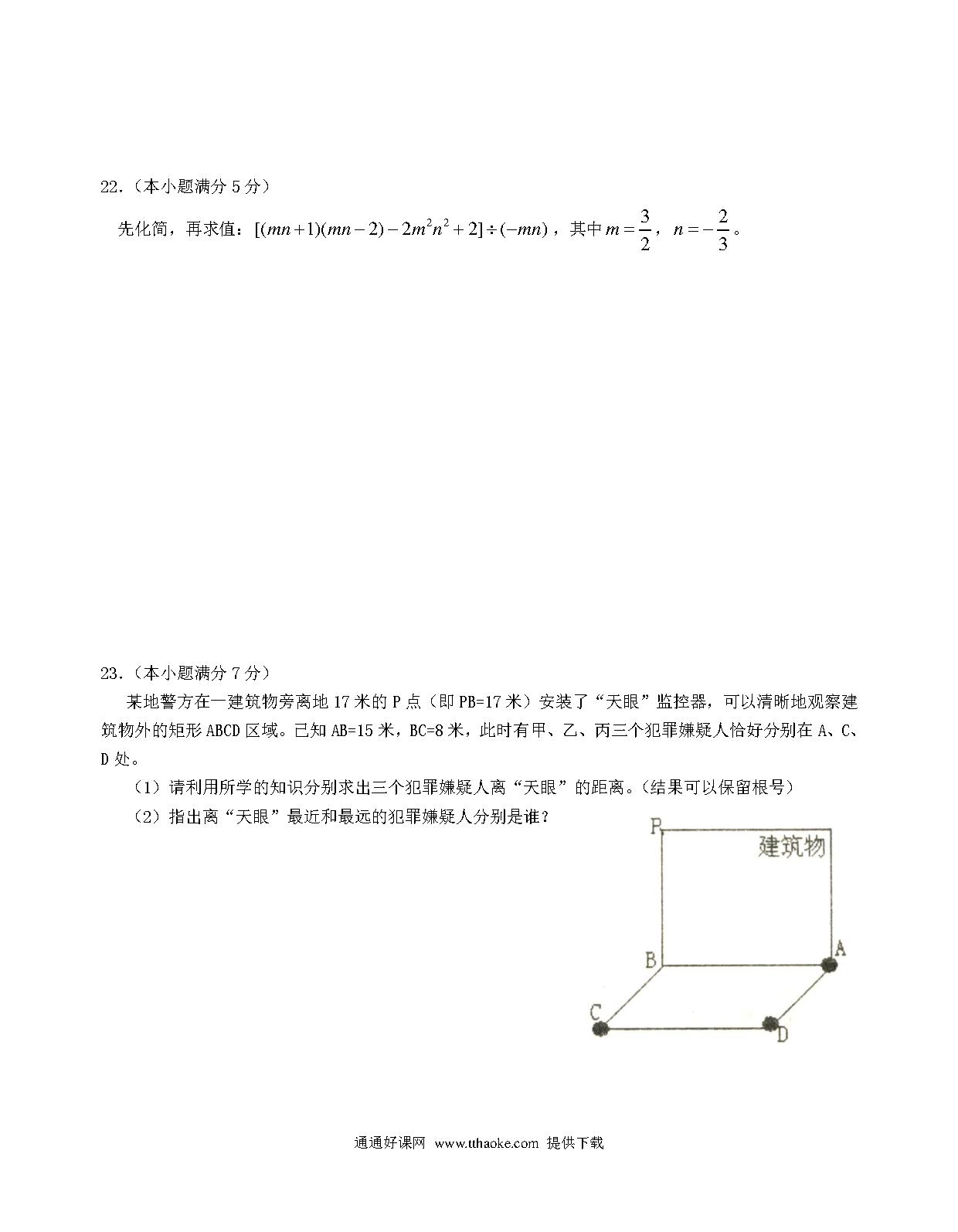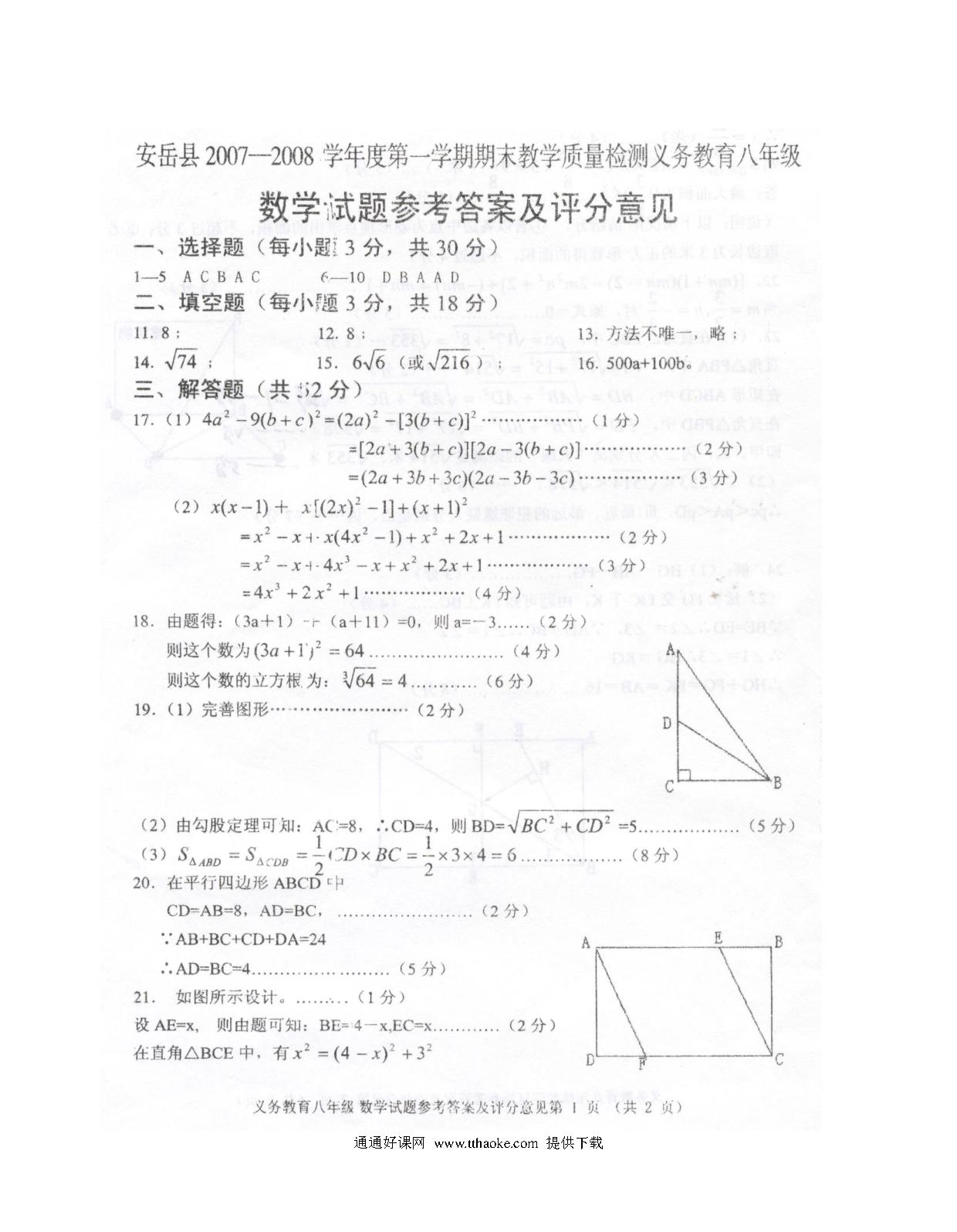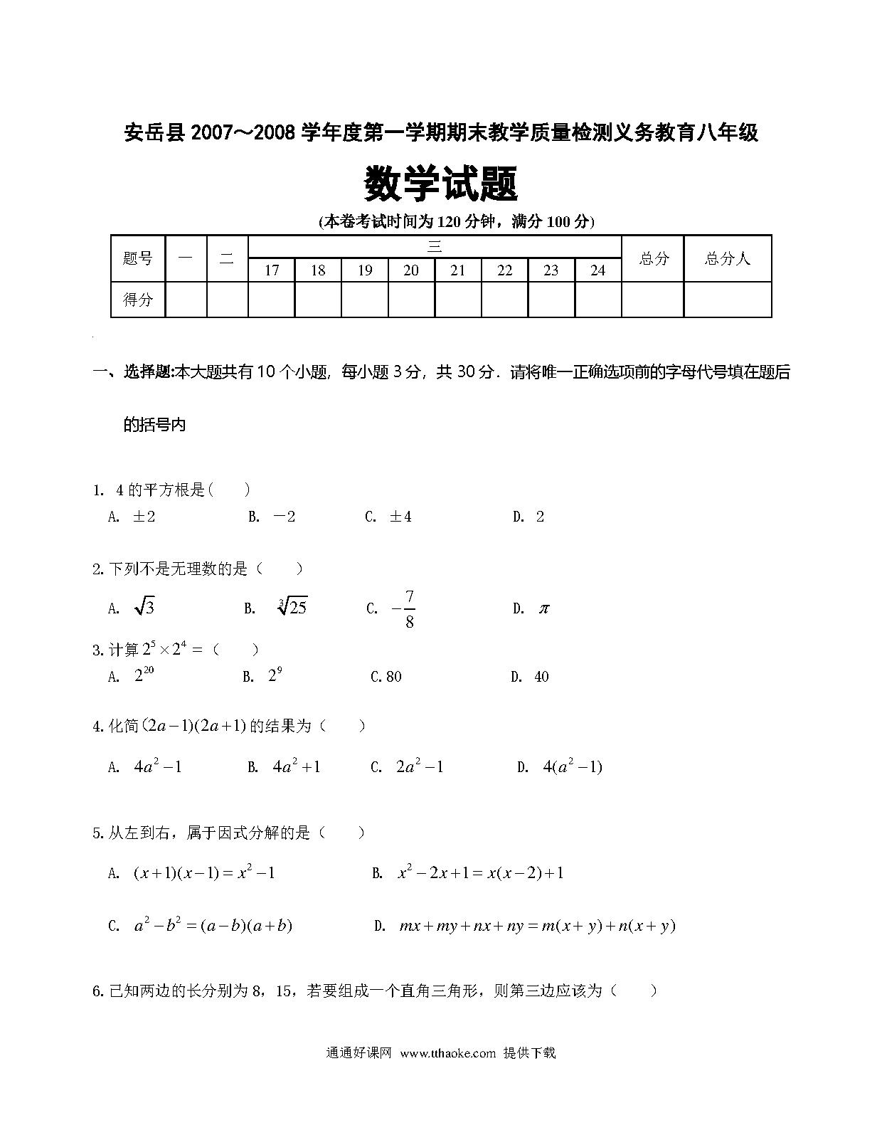 安岳县2007~2008学年度第一学期期末教学质量检测【华师大版】