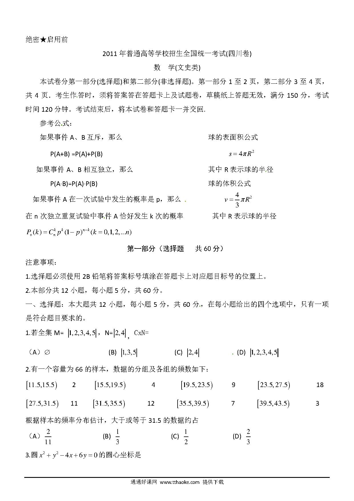 2011四川省高考文科数学试卷