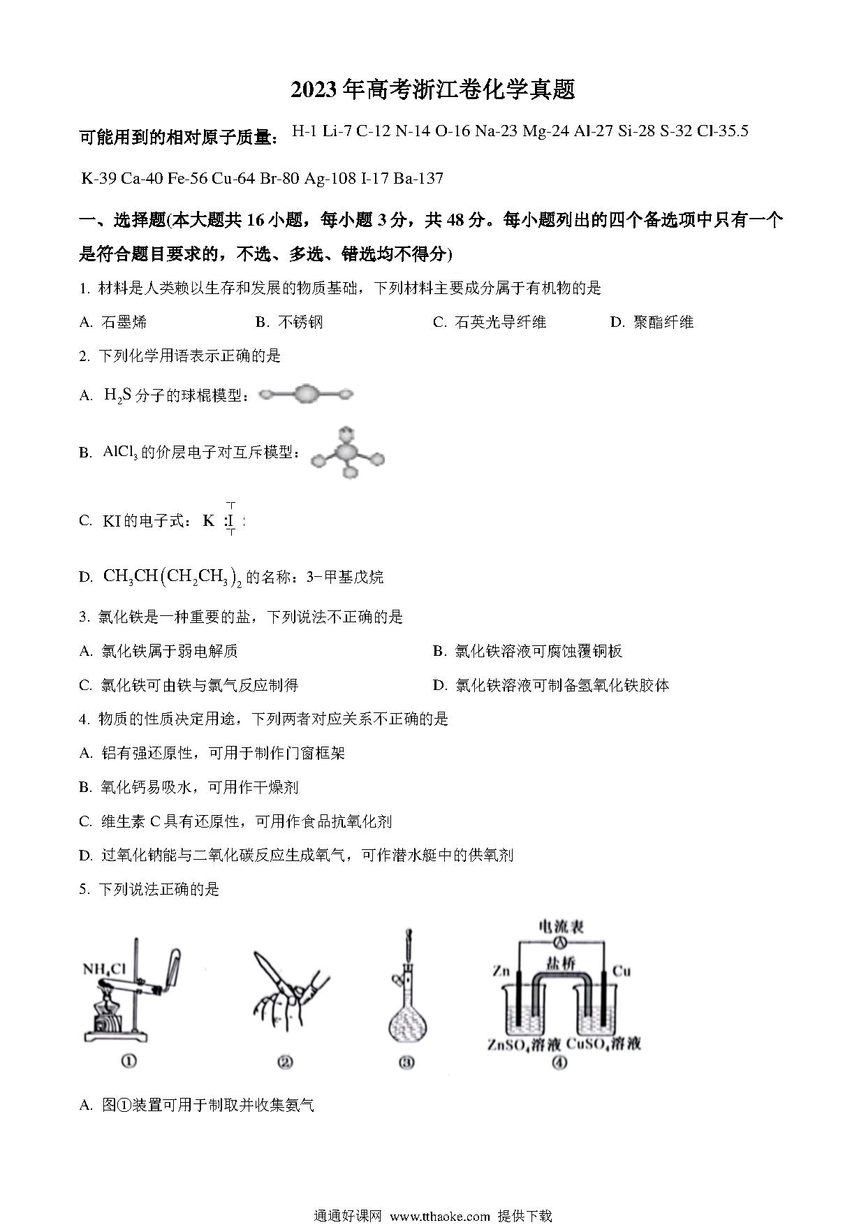 2023年高考浙江卷化学真题(6月)(原卷版).pdf