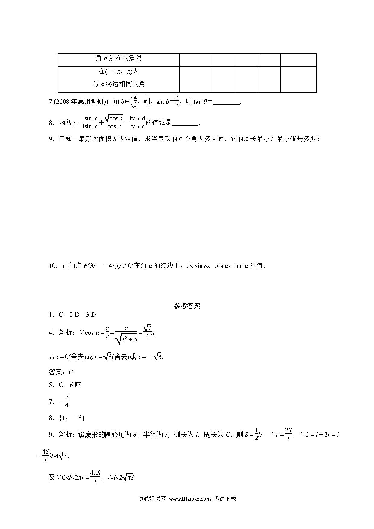 2011年高考一轮课时训练(理)5.1角的概念和弧度制及任意角的三