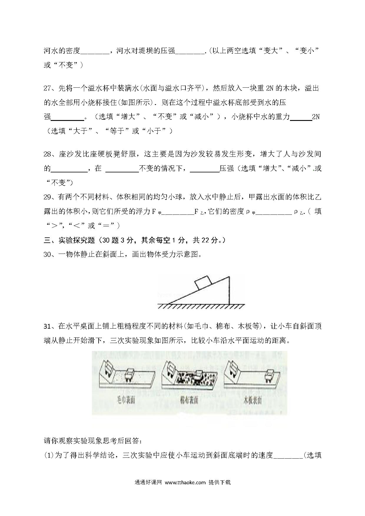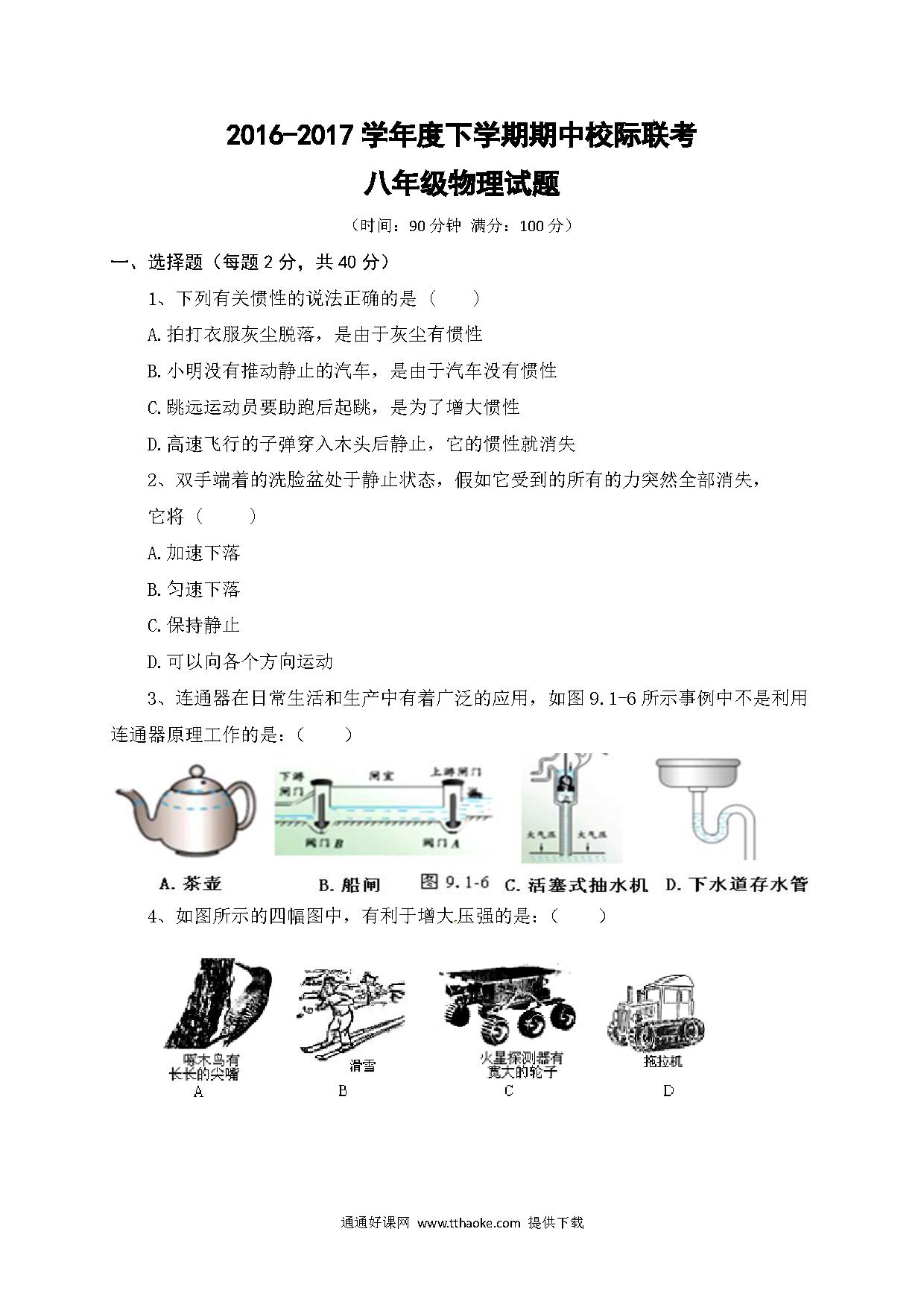 西华县2016-2017年八年级下学期物理期中试题及答案