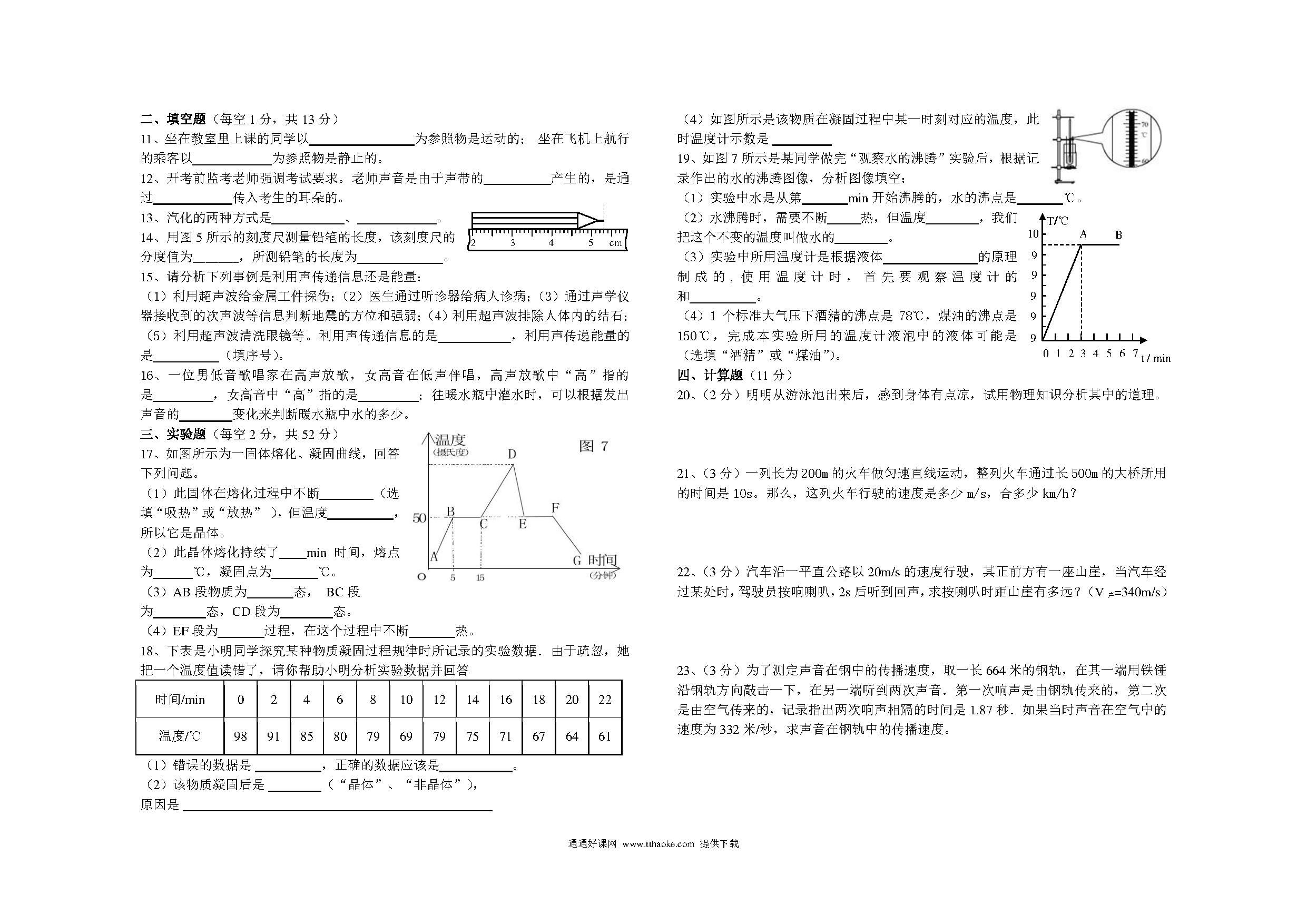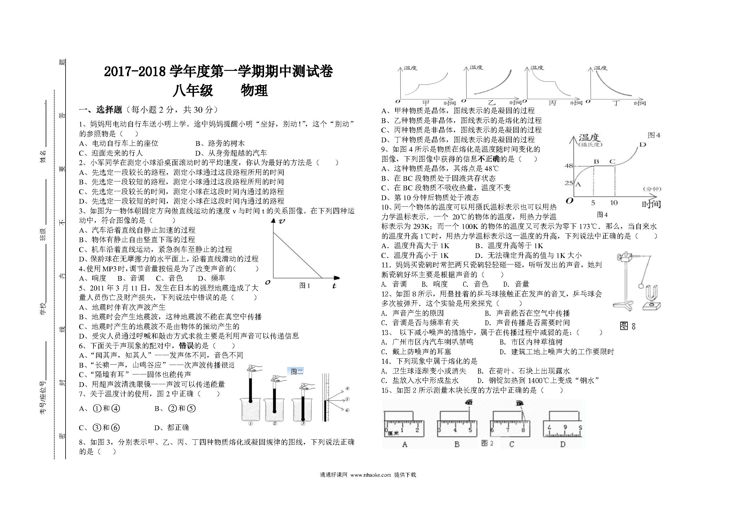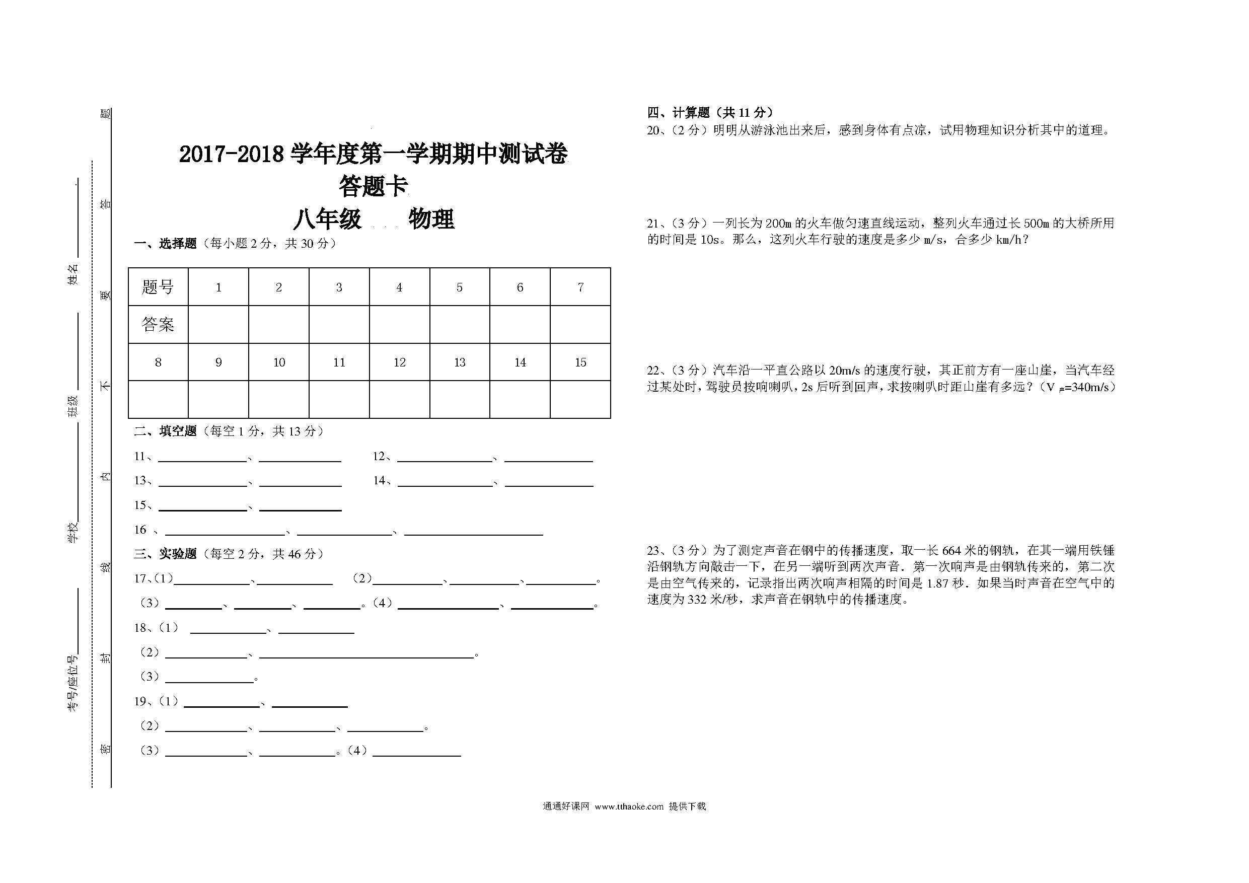 2017.11八年级物理期中考试试卷及答案