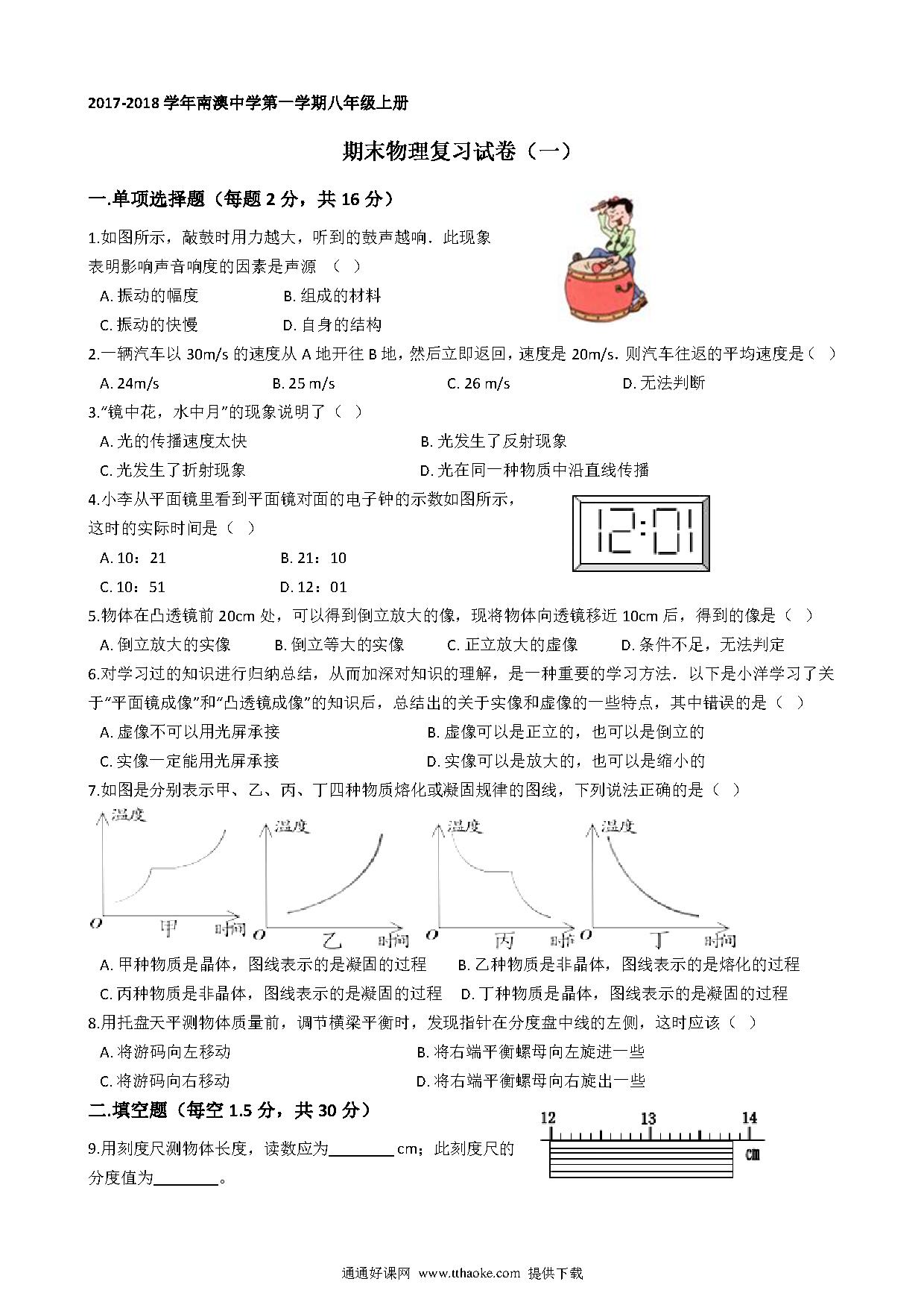 2017-2018年南澳中学第一学期八年级上册物理期末复习试卷(一).pdf