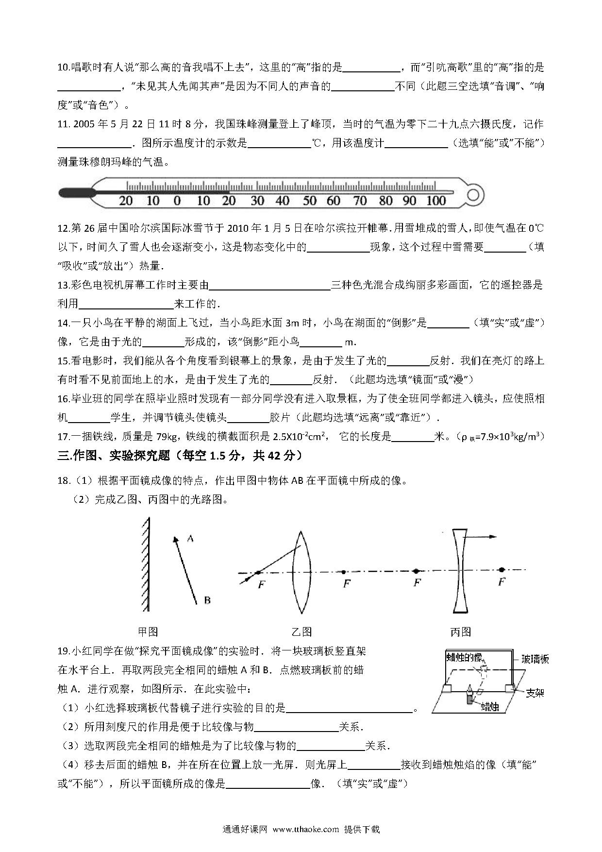 文安县2016-2017学年第二学期八年级物理期中试卷及答案