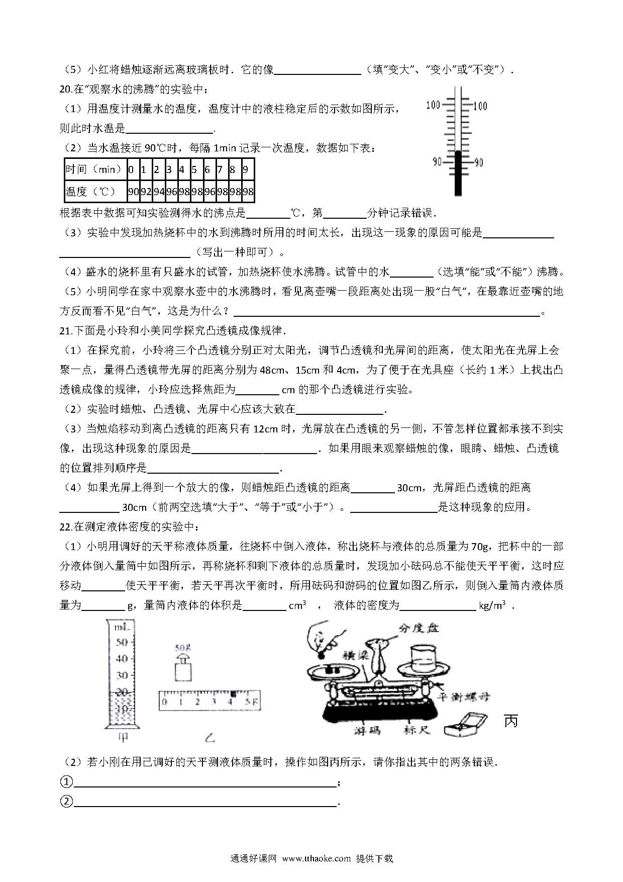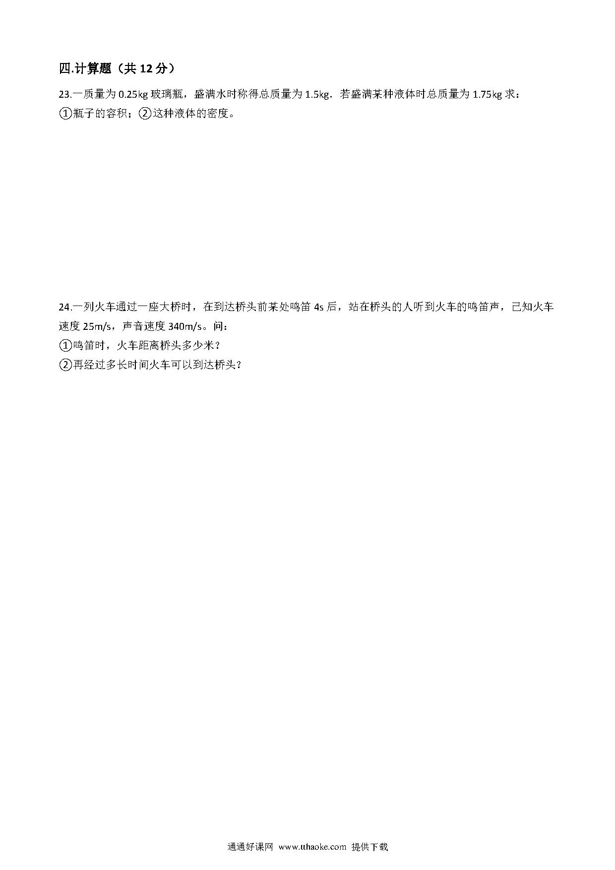 厦门市同安区016-2017学年八年级第二学期物理期中试卷及答案