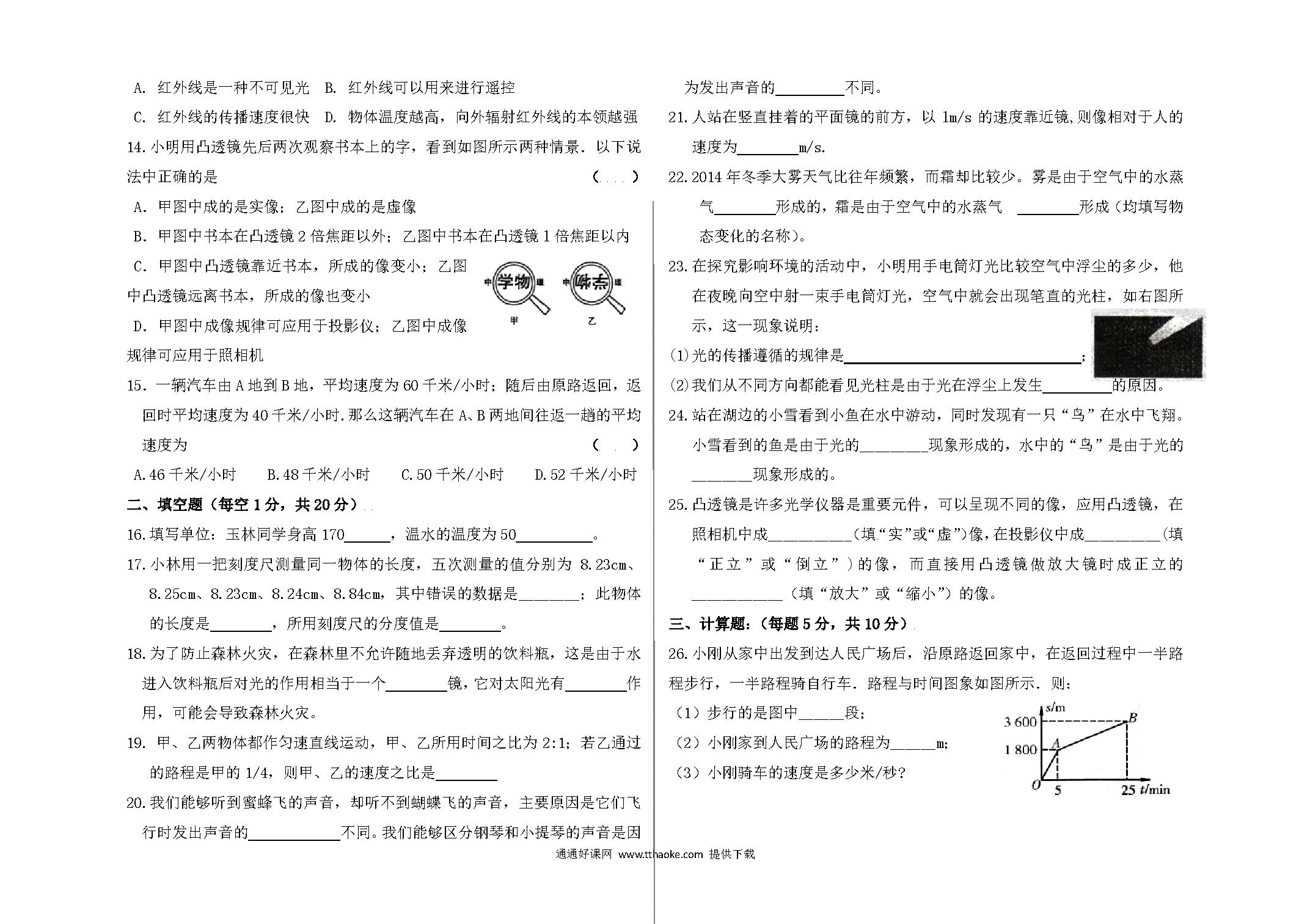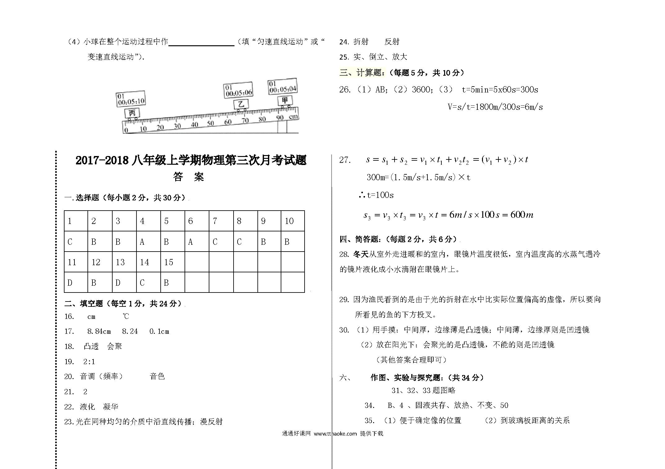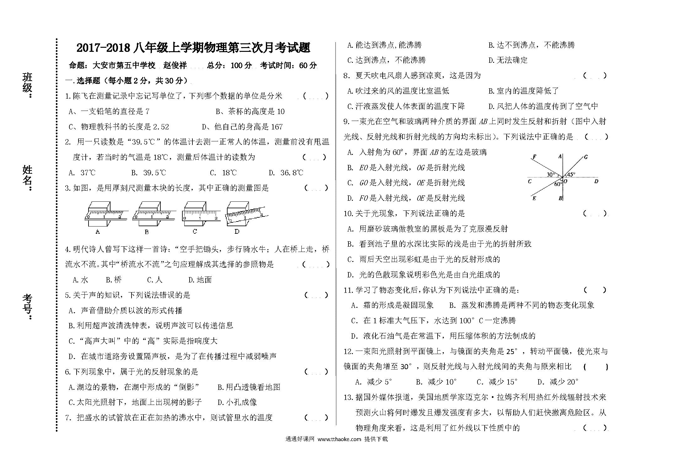 2017.11八年级物理期中考试试卷及答案