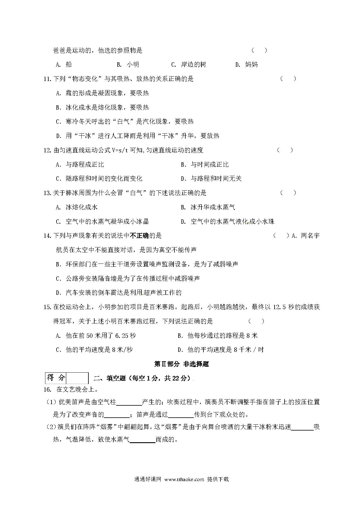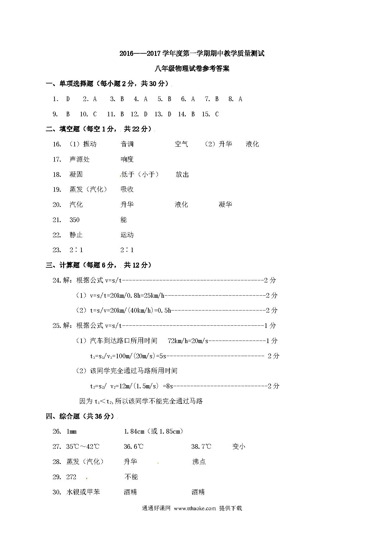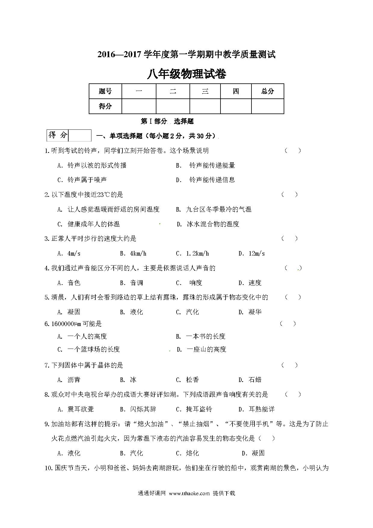 长春市九台区2016-2017学年第一学期八年级物理期中试卷及答案.pdf