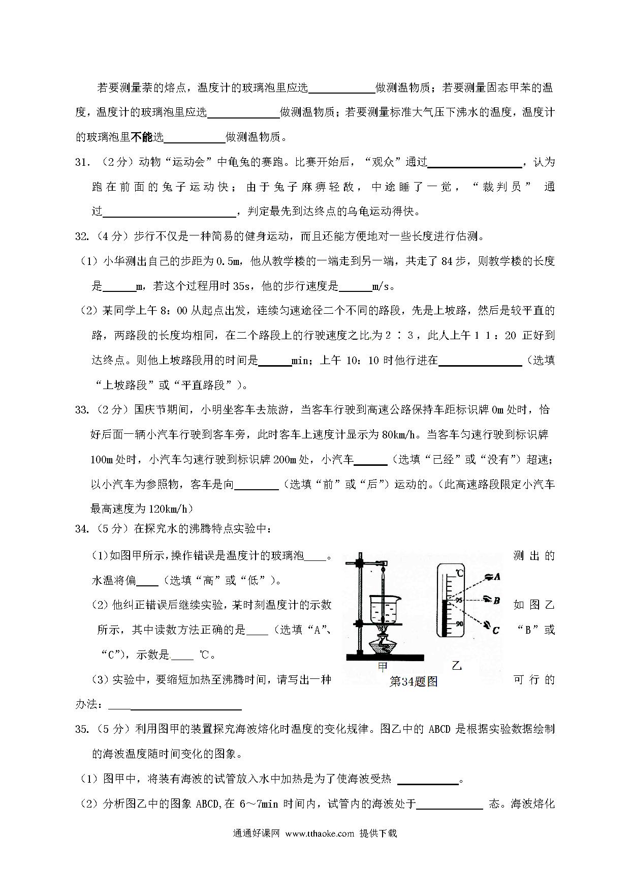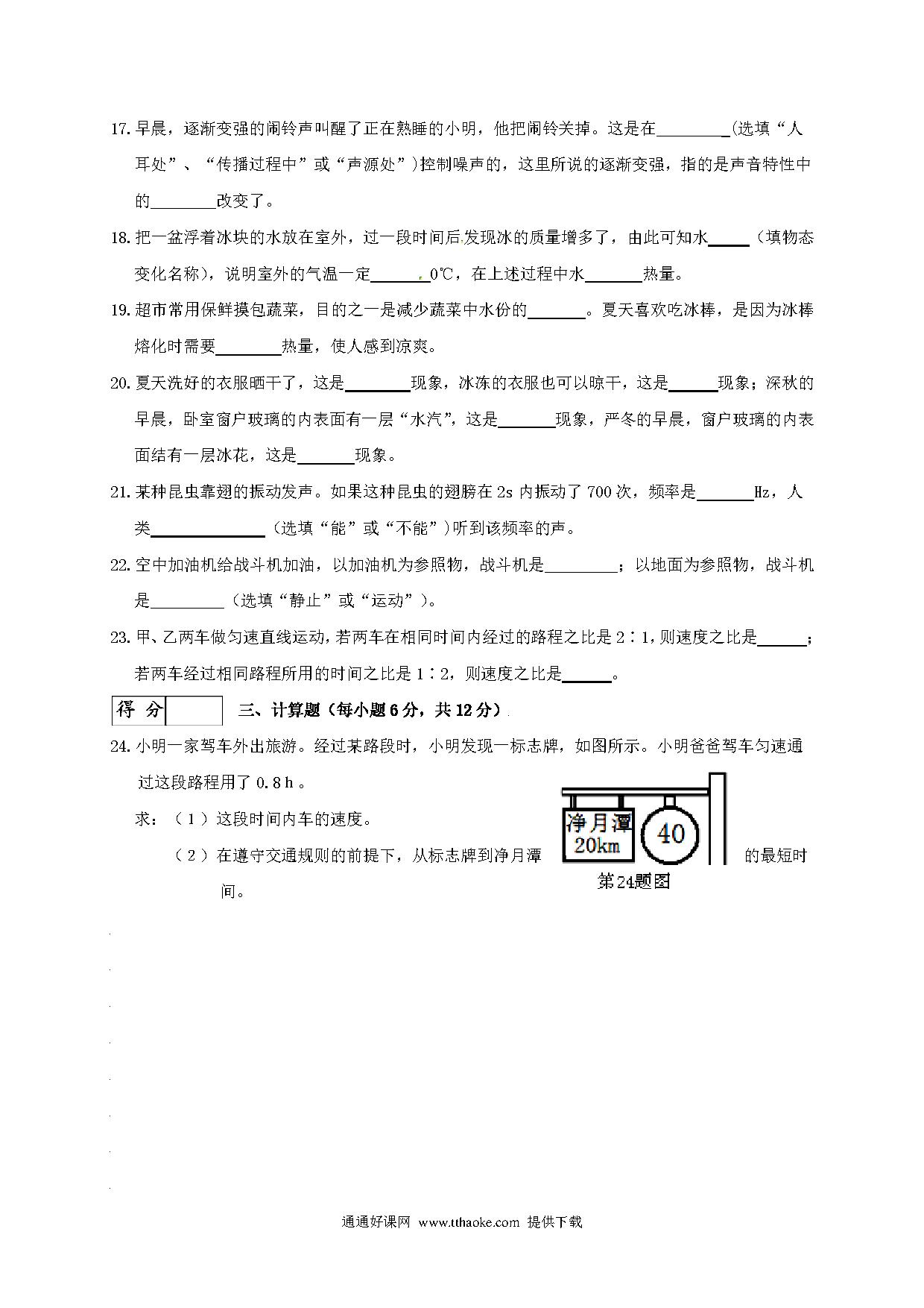 文安县2016-2017学年第二学期八年级物理期中试卷及答案