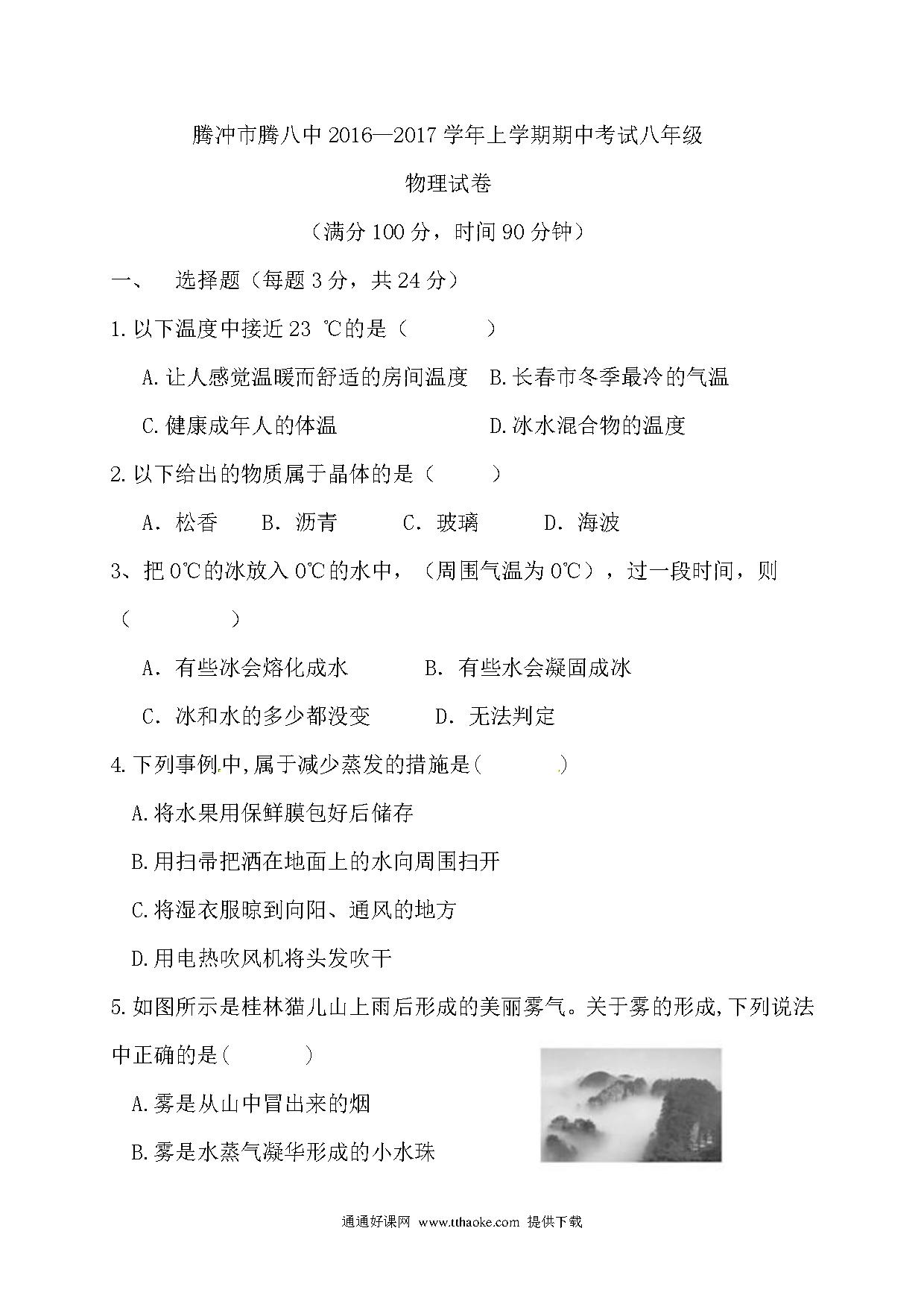 腾冲八中2016-2017年八年级上学期物理期中试卷及答案.pdf