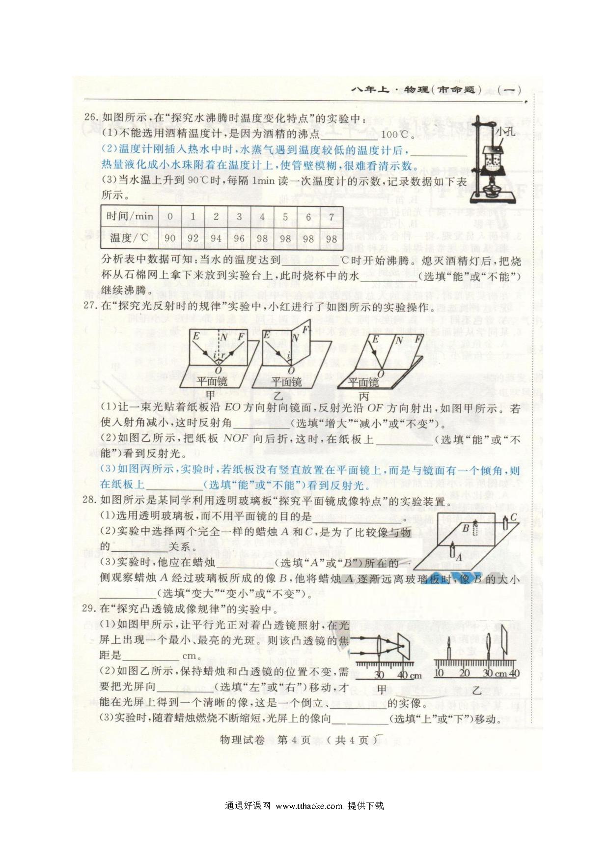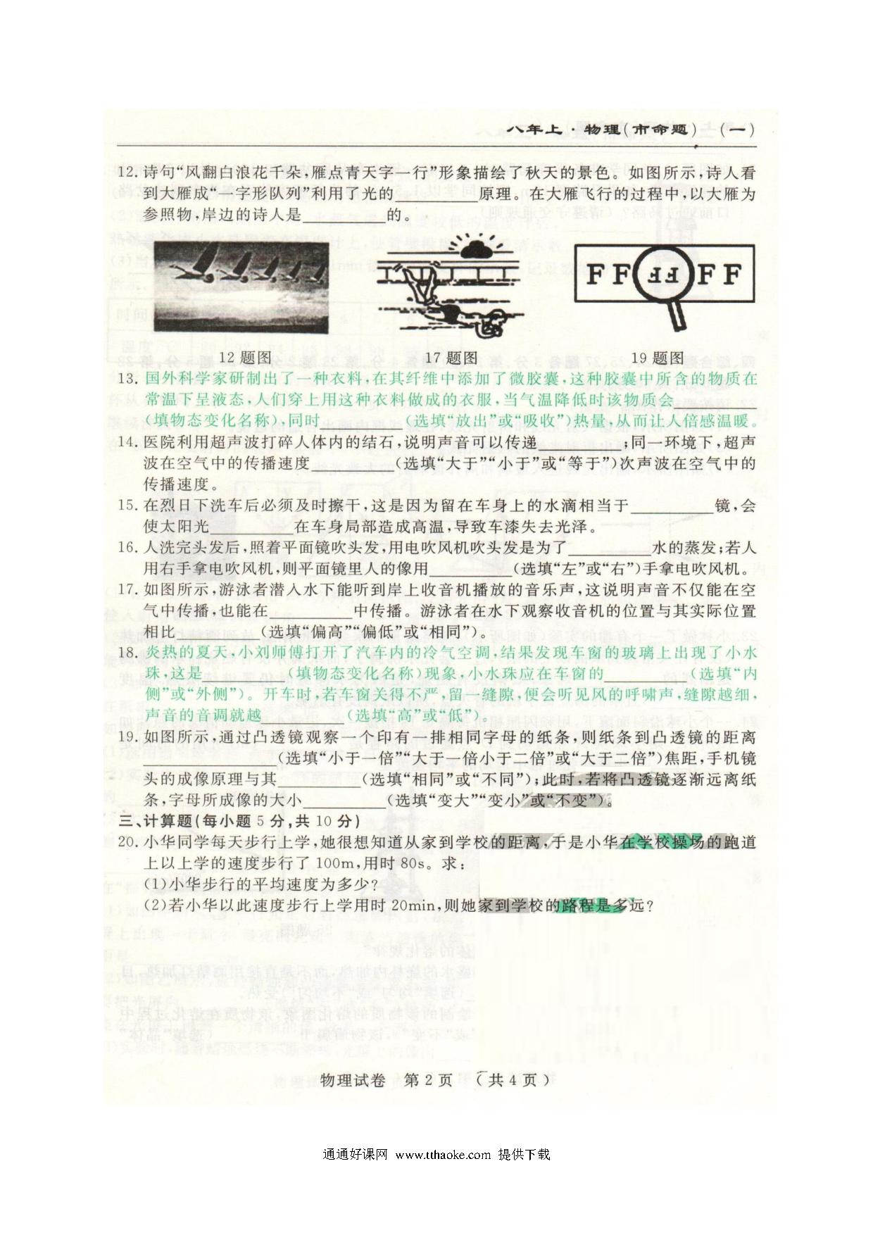 文安县2016-2017学年第二学期八年级物理期中试卷及答案