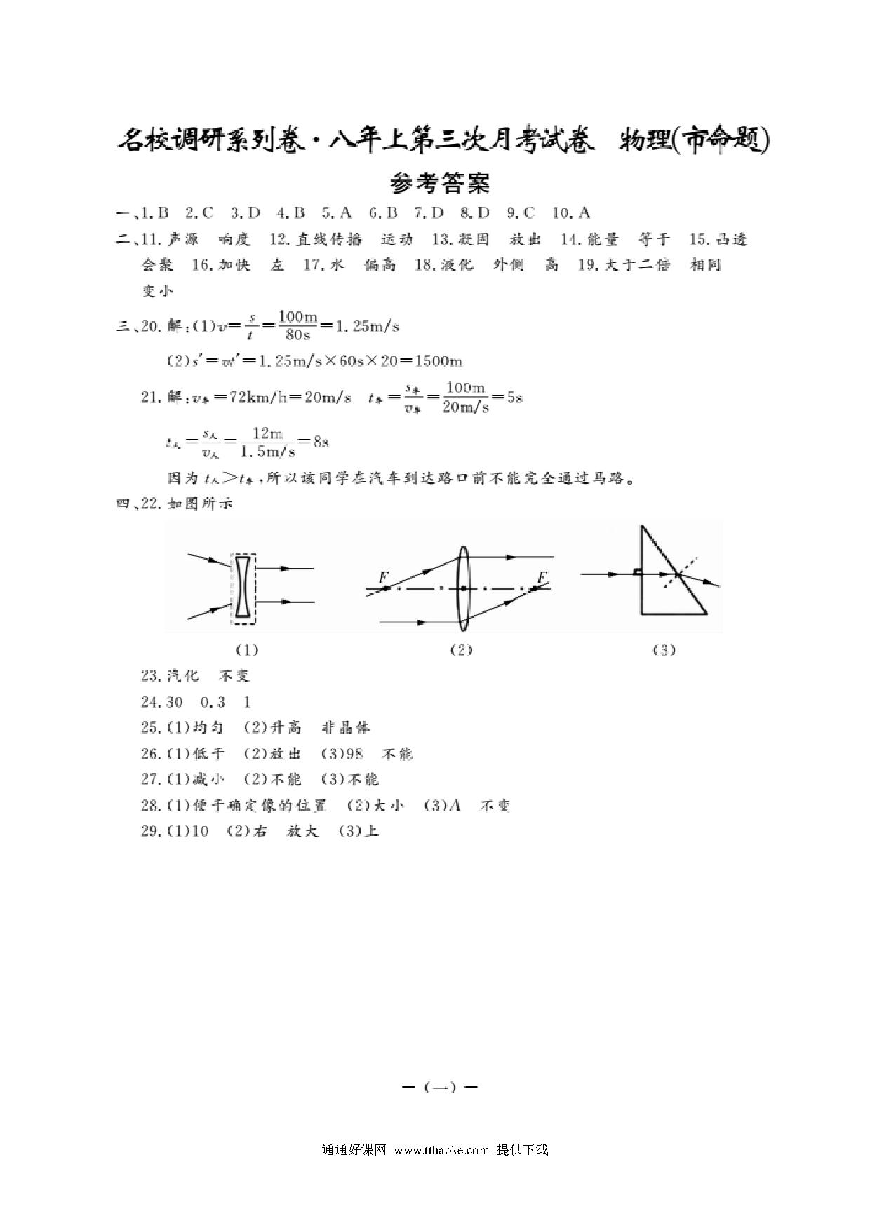 市命题长春名校调研2016年八年级上学期第三次月考物理试题及答案