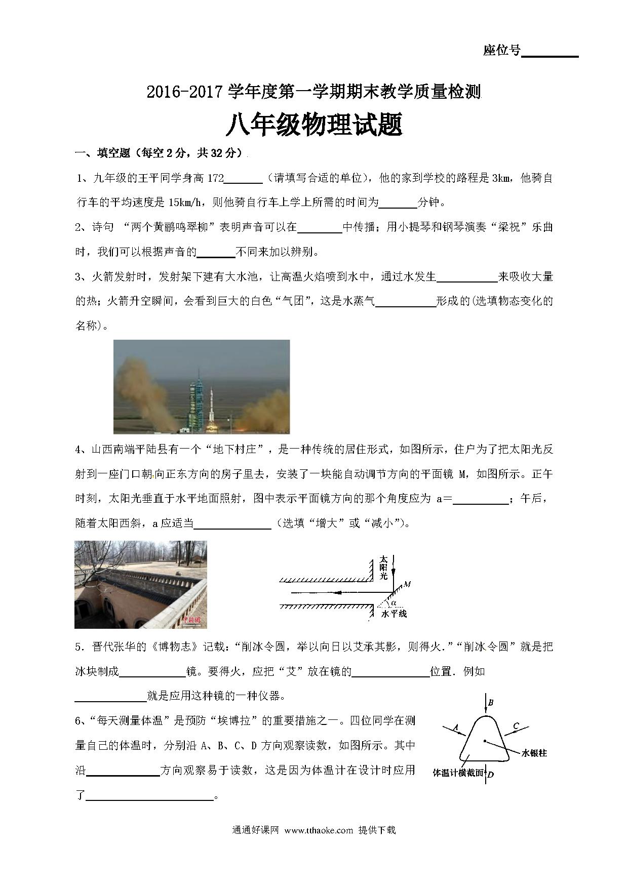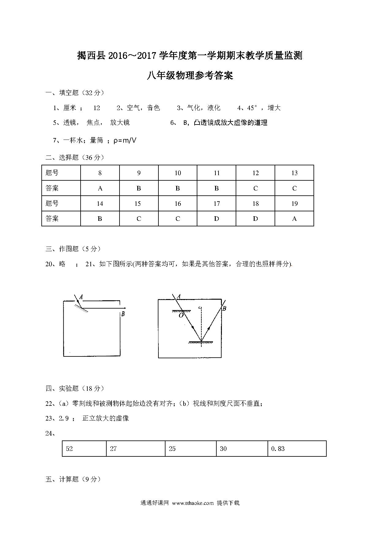 揭西县2016-2017年第一学期八年级物理期末考试题及答案