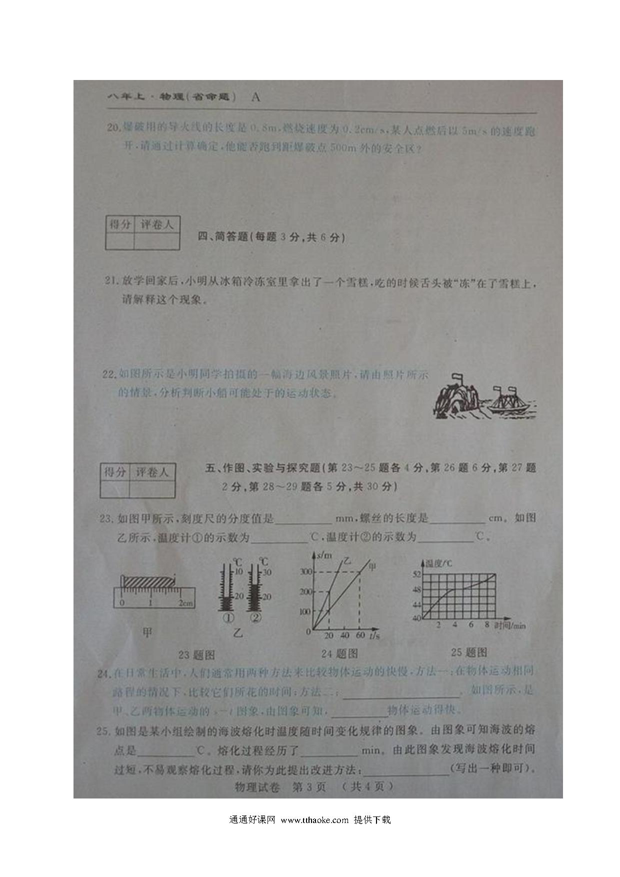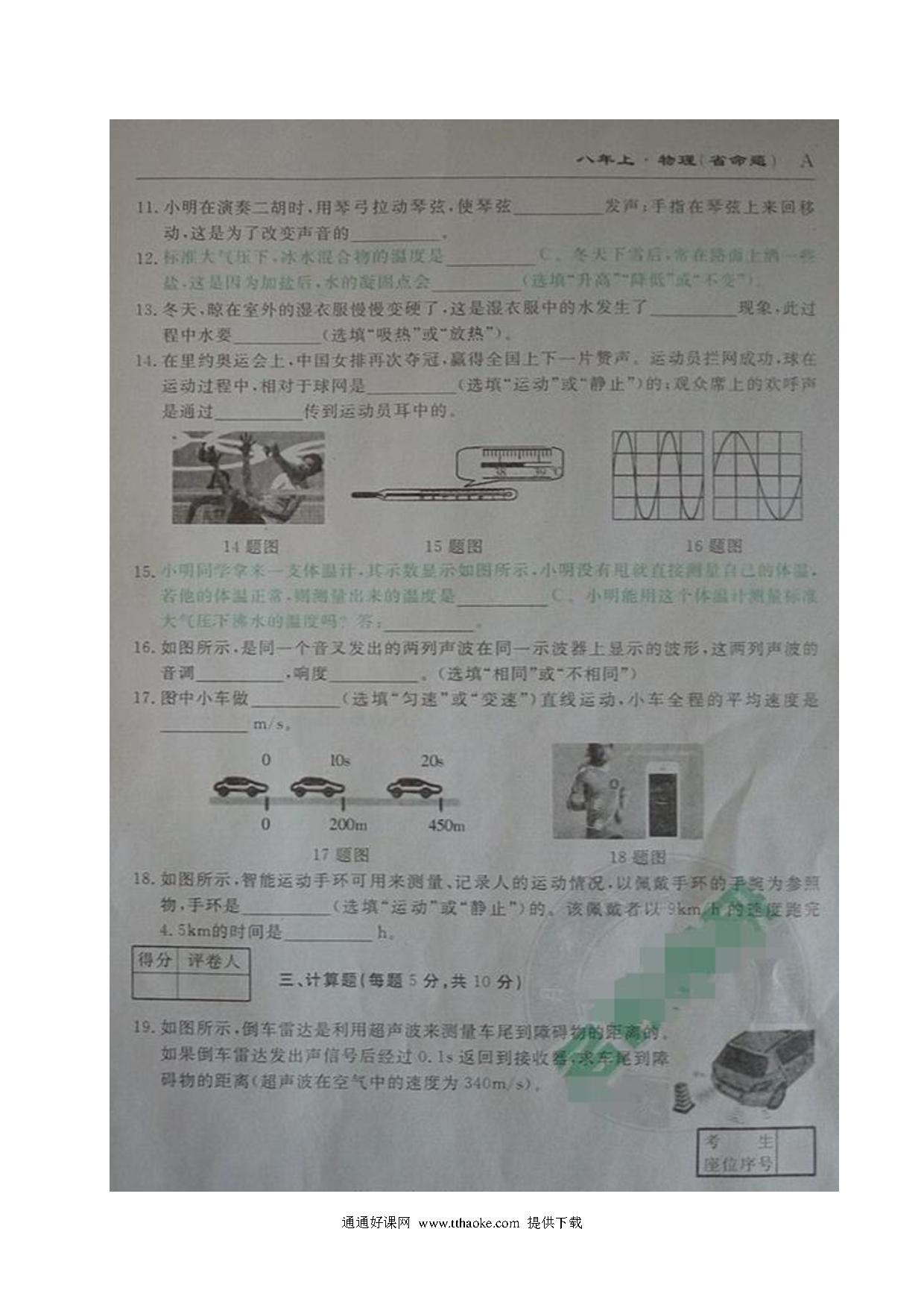 文安县2016-2017学年第二学期八年级物理期中试卷及答案