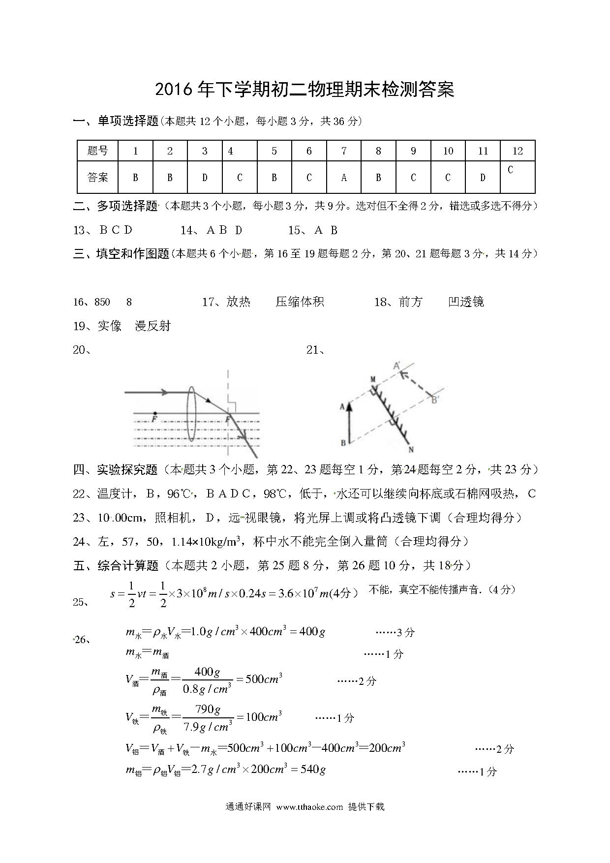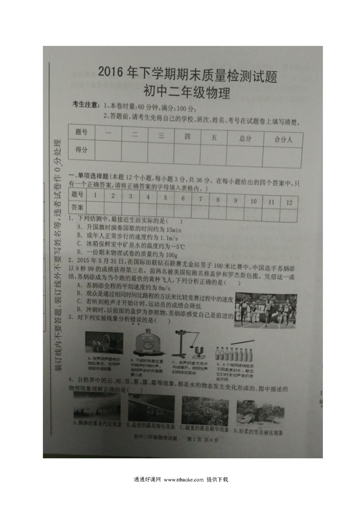 重庆市开州区2016-2017学年第二学期八年级物理期末试题及答案