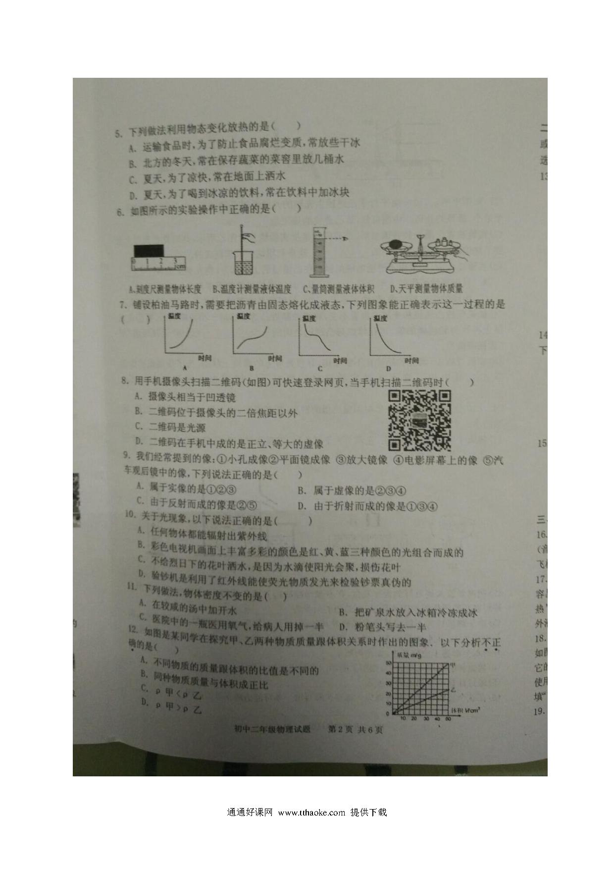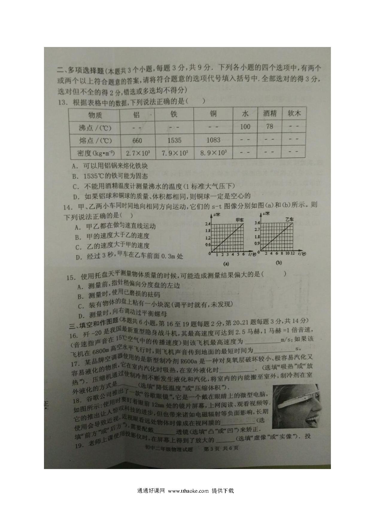 文安县2016-2017学年第二学期八年级物理期中试卷及答案