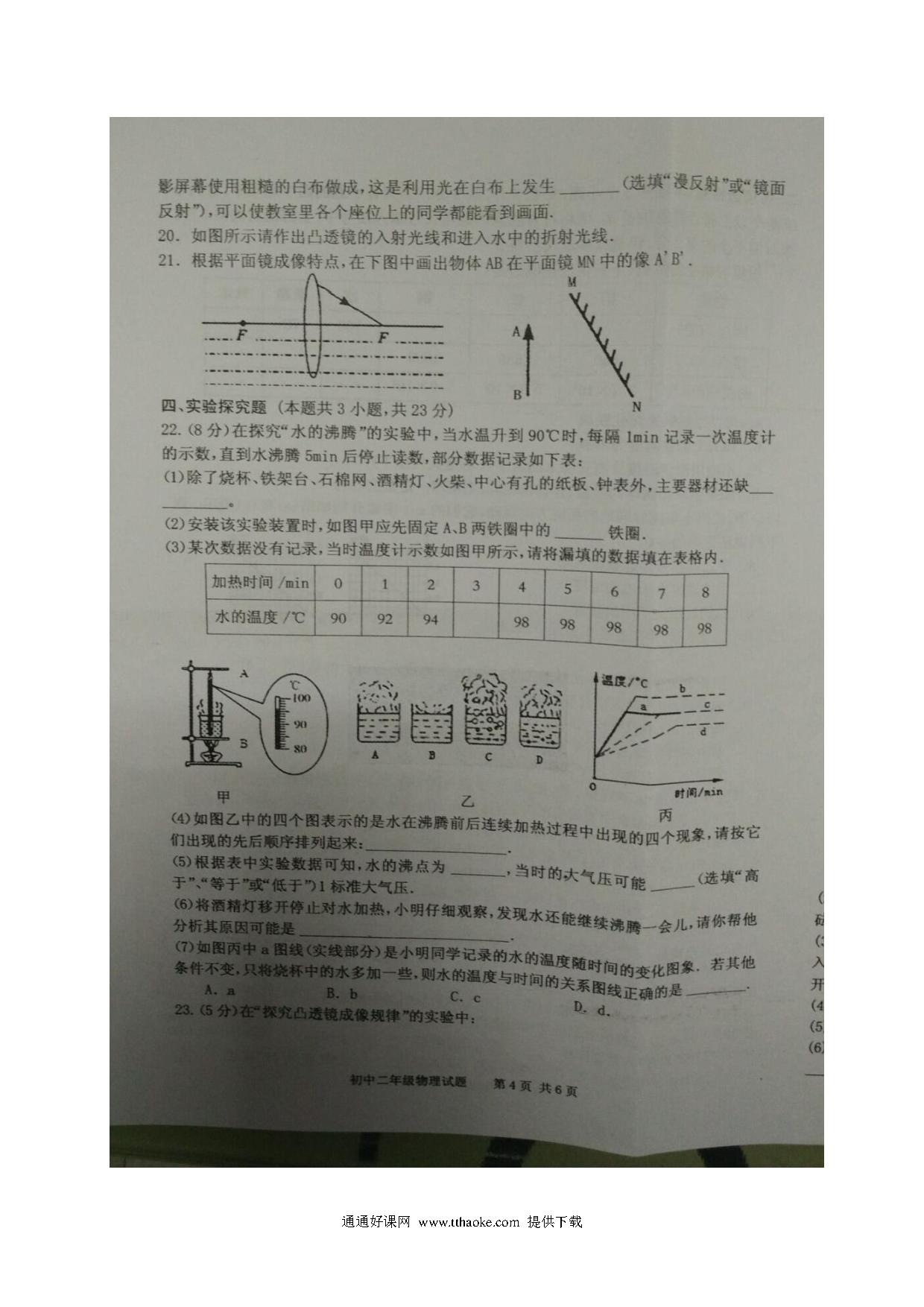 厦门市同安区016-2017学年八年级第二学期物理期中试卷及答案