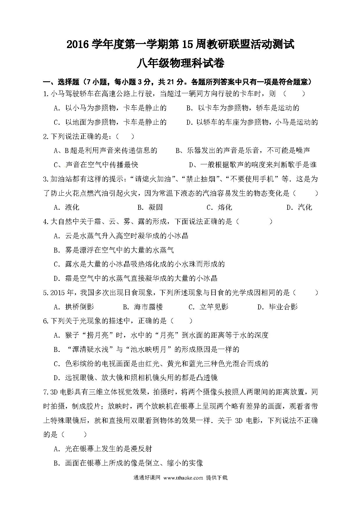佛山市顺德区2016年初二物理12月月考试题及答案.pdf
