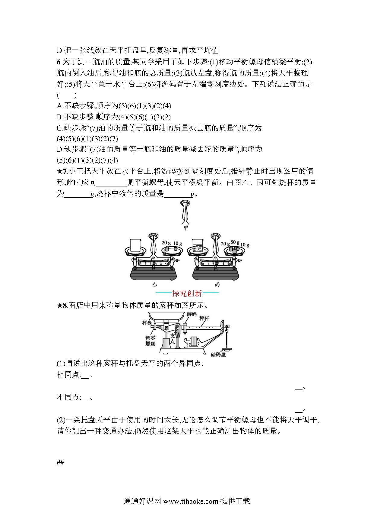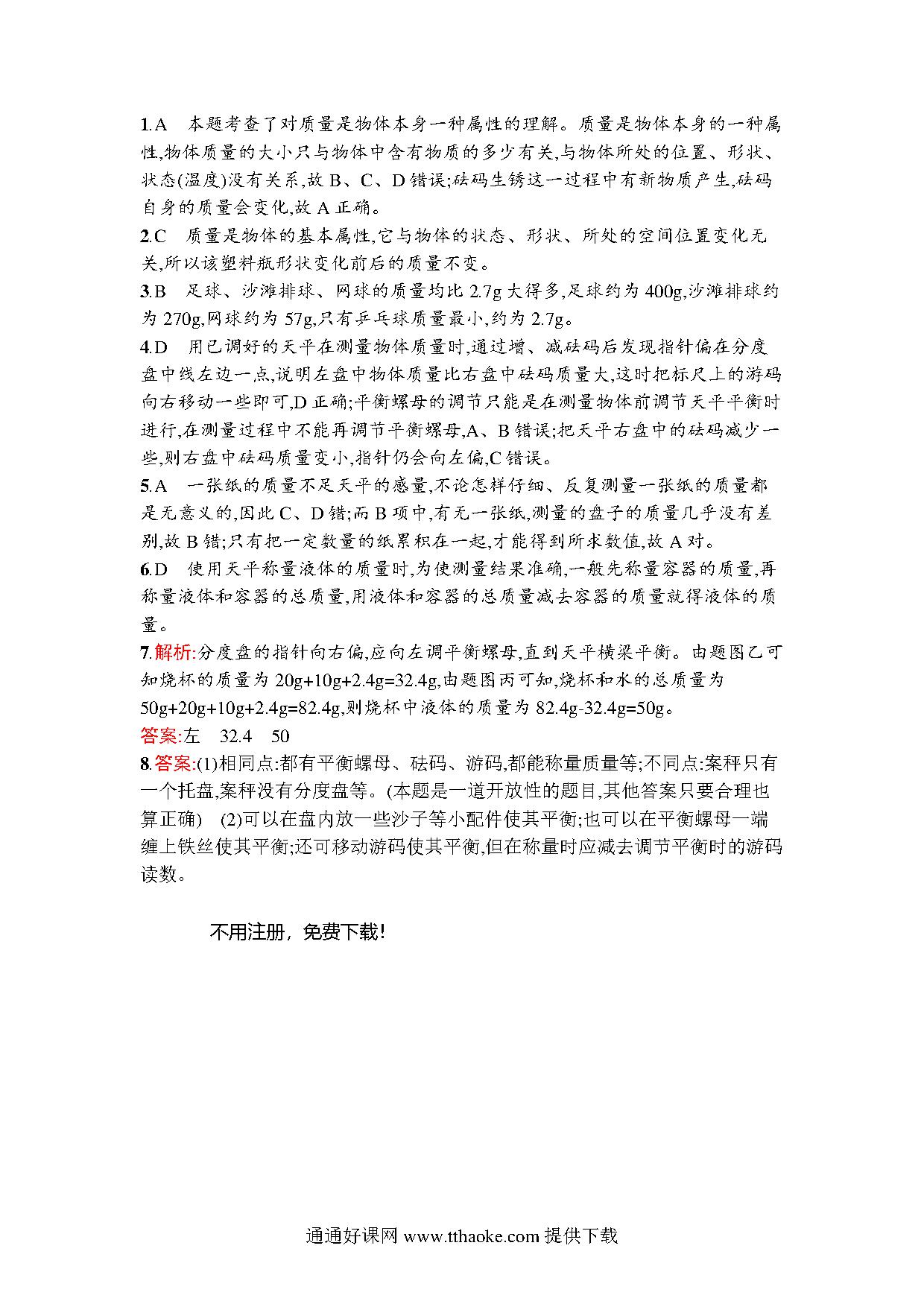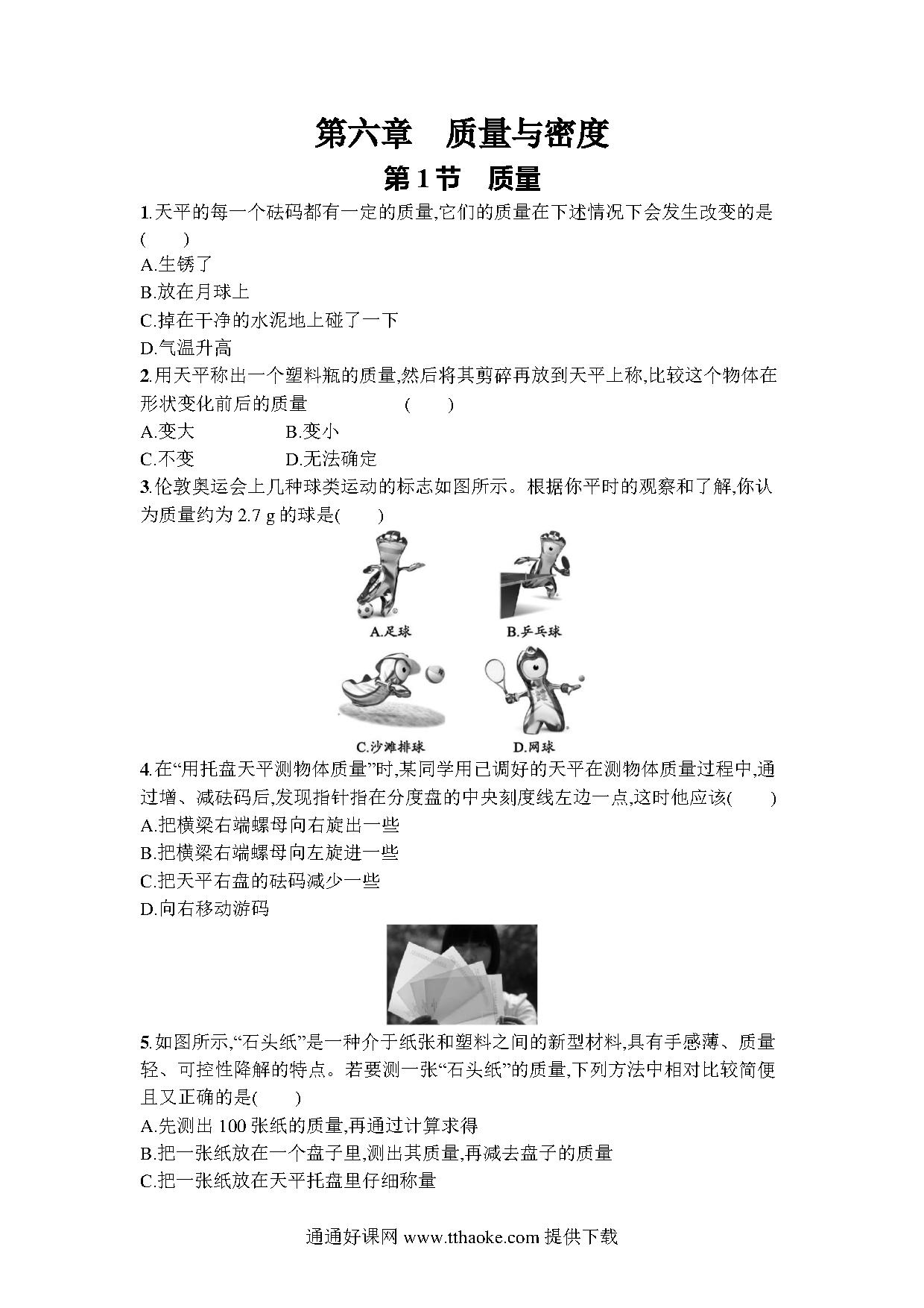 2016年人教版八年级物理上册第六章质量与密度课时练习题及答案