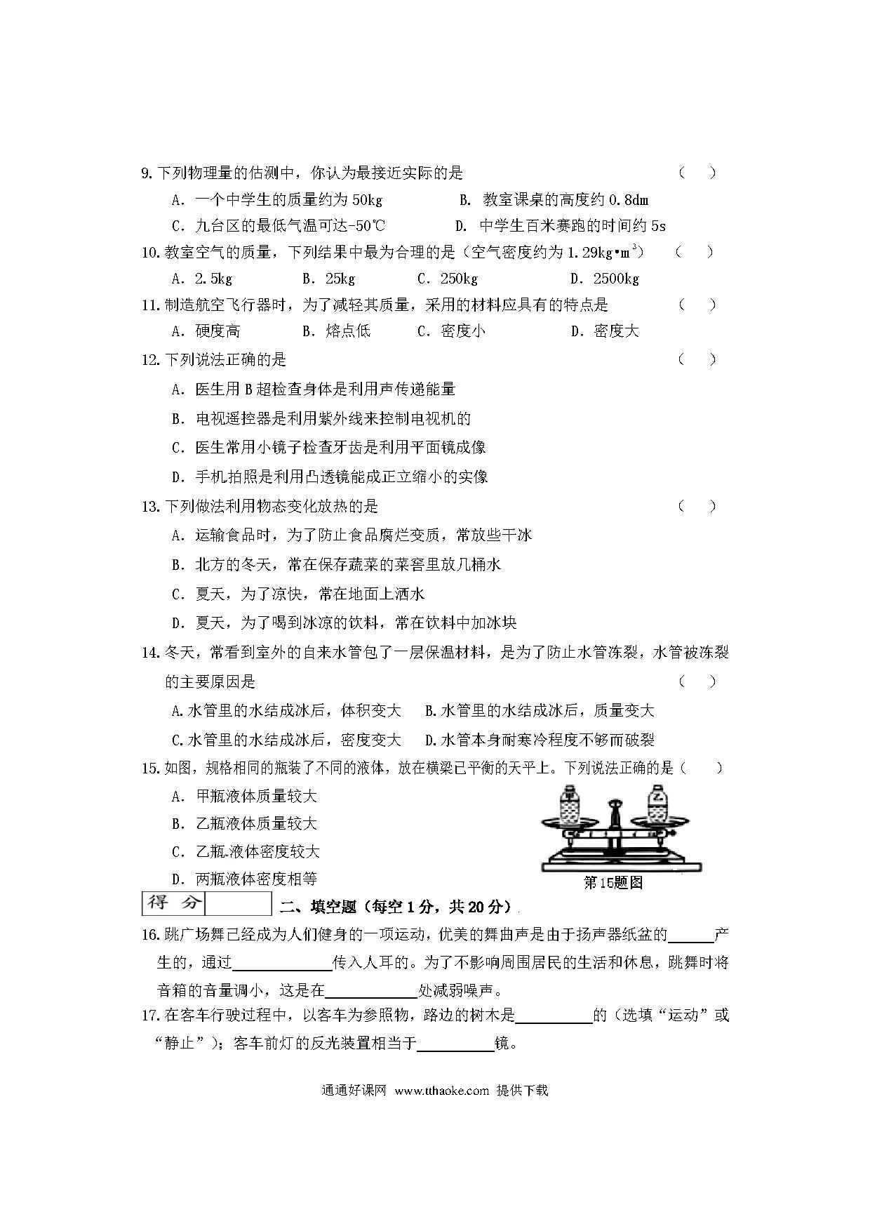 长春市九台区2015-2016学年初二物理期末试题及答案