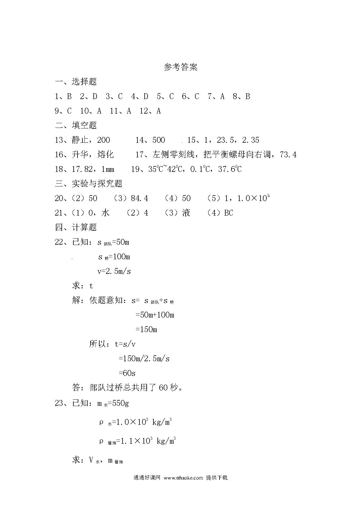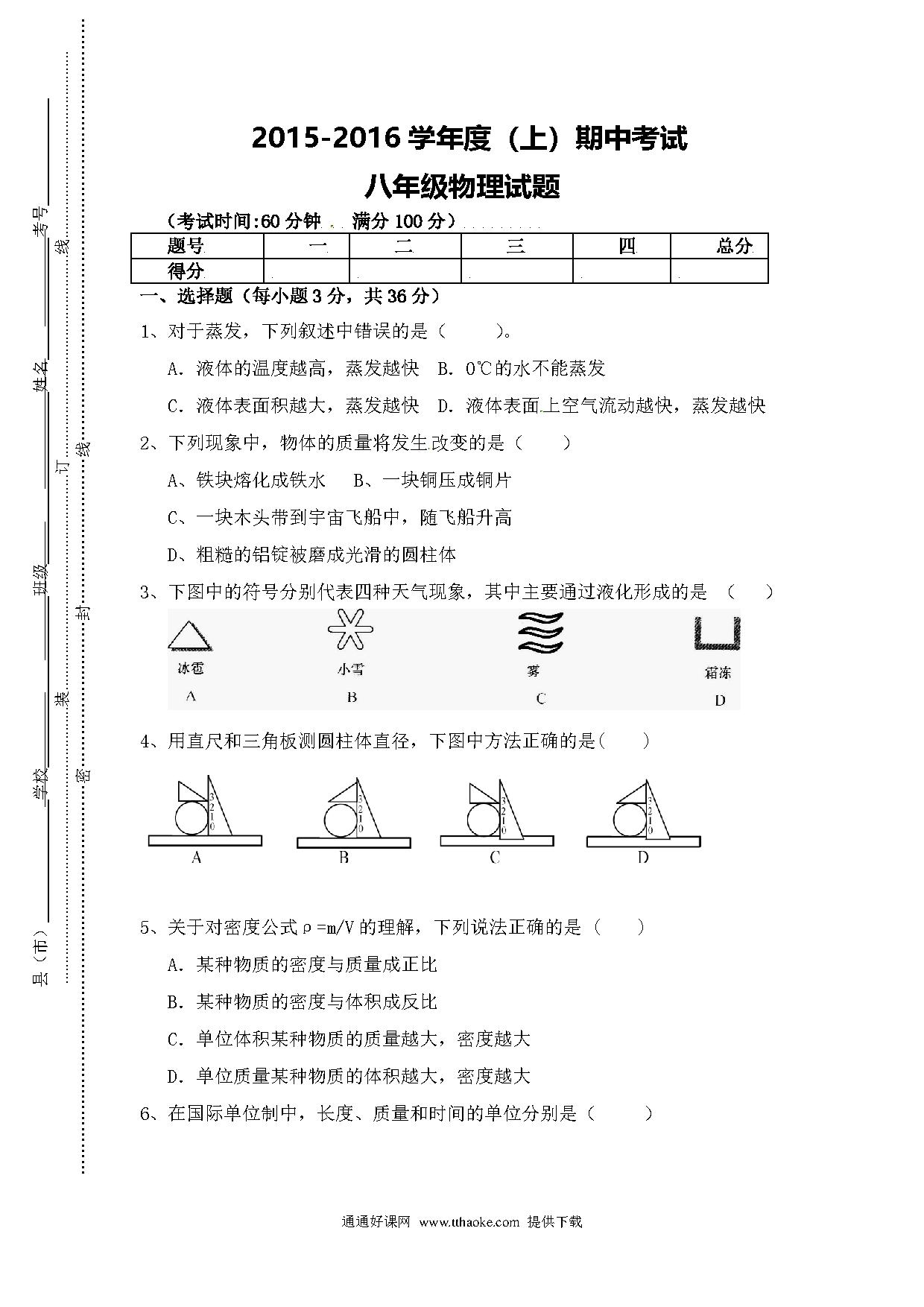 泾阳县2015-2016年八年级物理上期中试题及答案