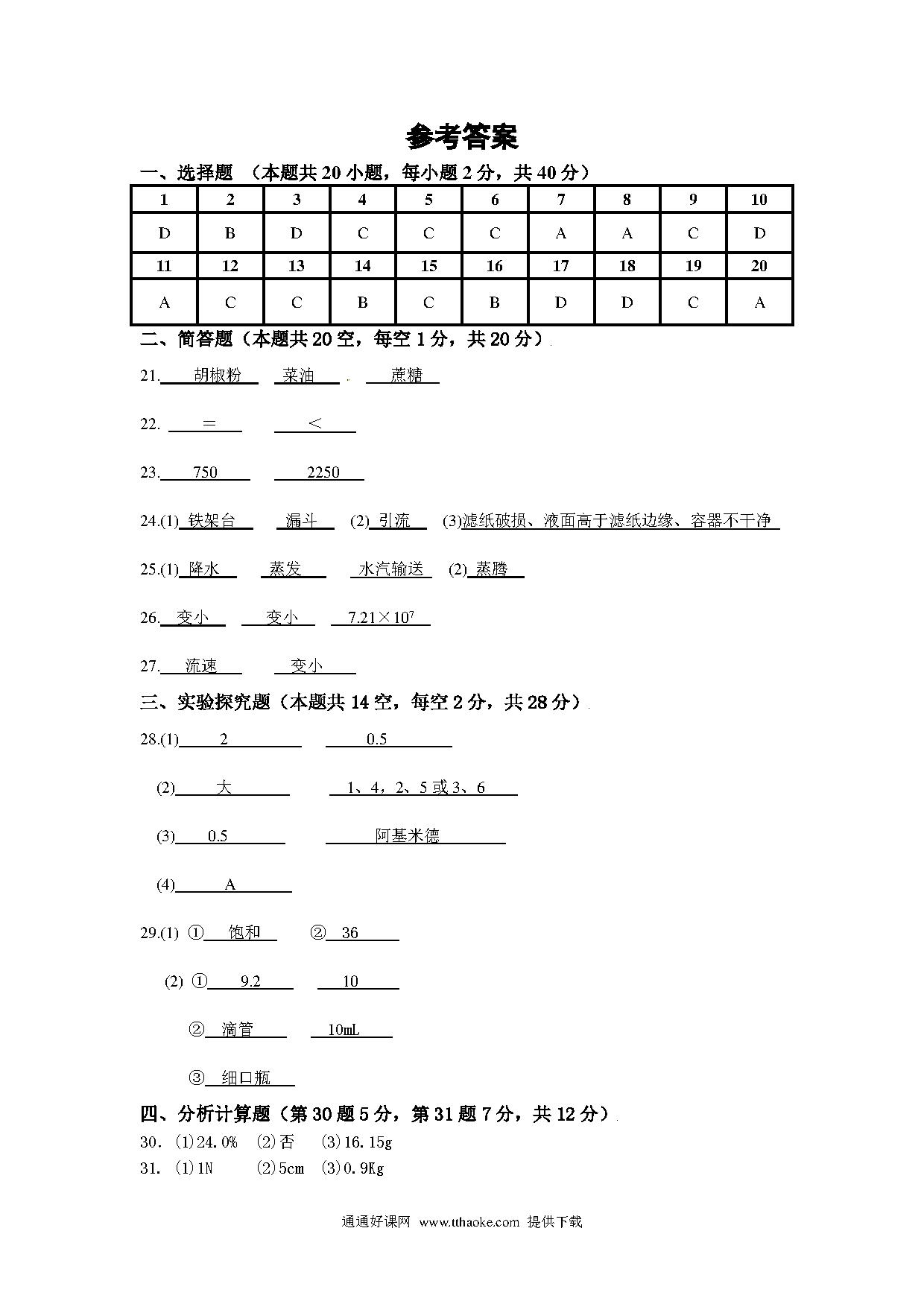 重庆市开州区2016-2017学年第二学期八年级物理期末试题及答案