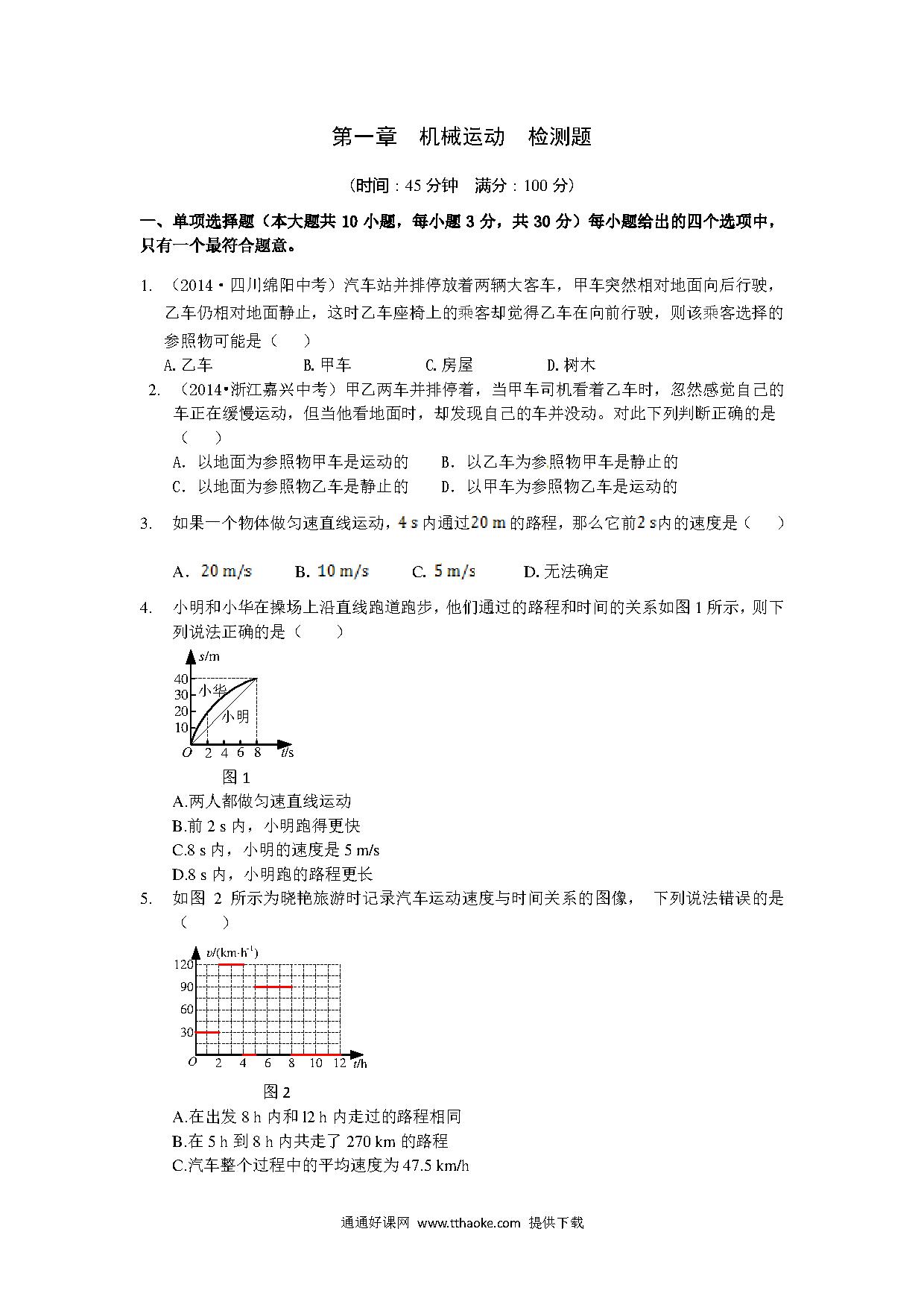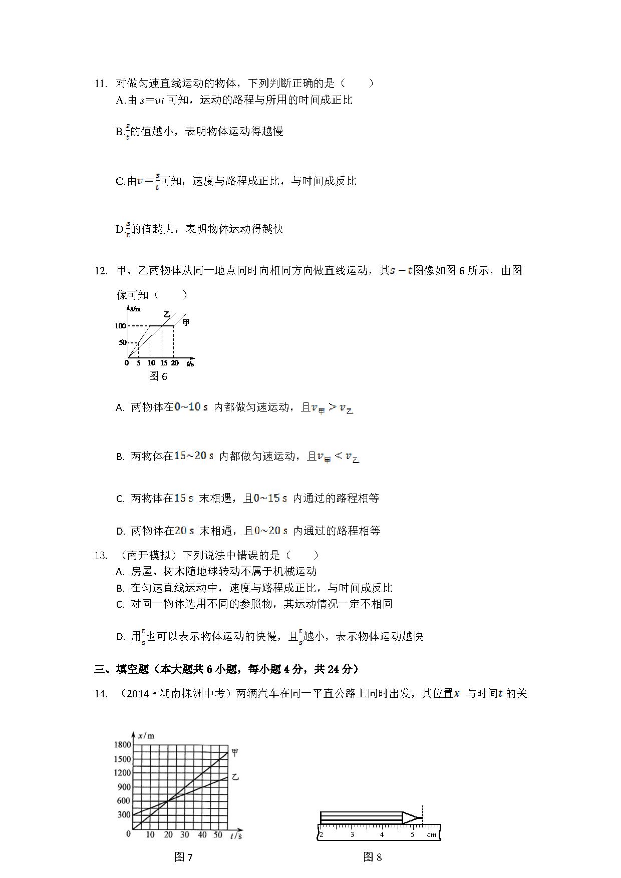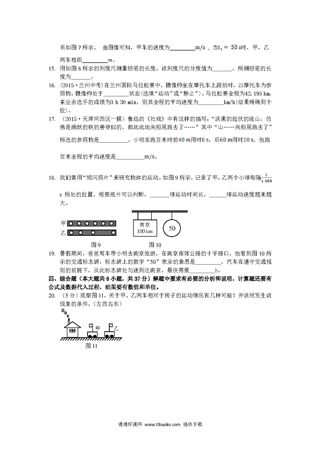 全解2015年八年级物理上册第一章 机械运动检测题附解析