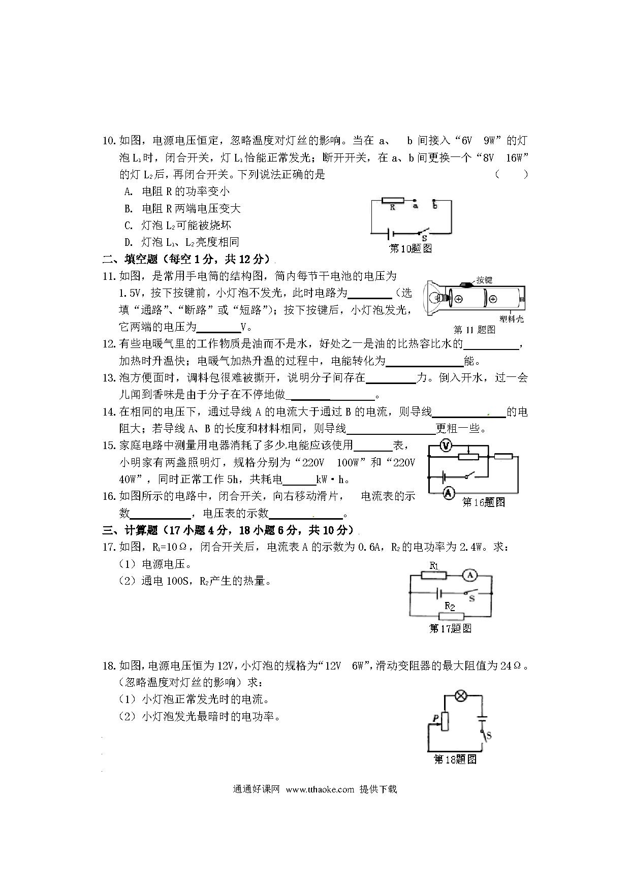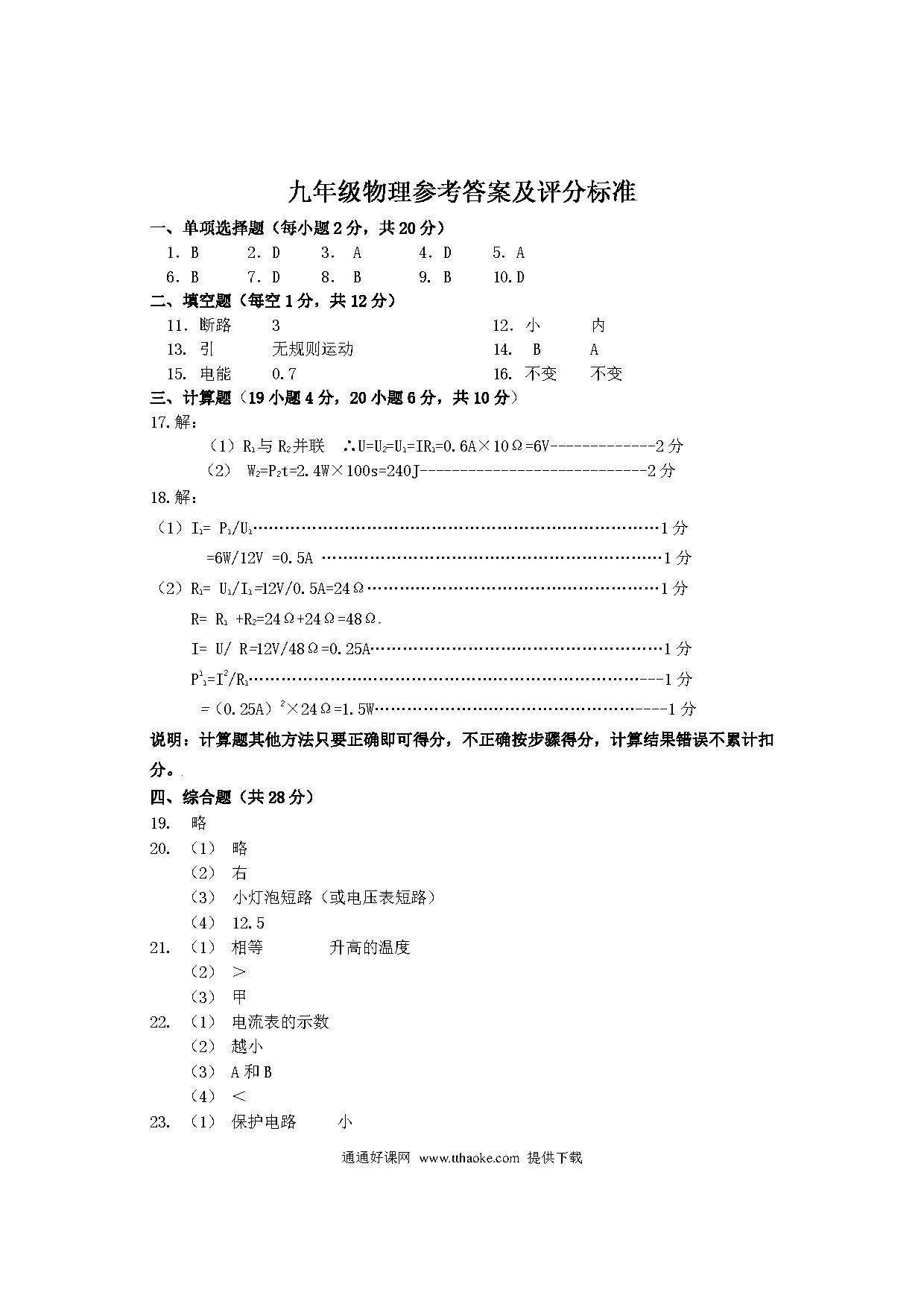 满洲里市2017-2018学年度上学期九年级物理期末试题及答案