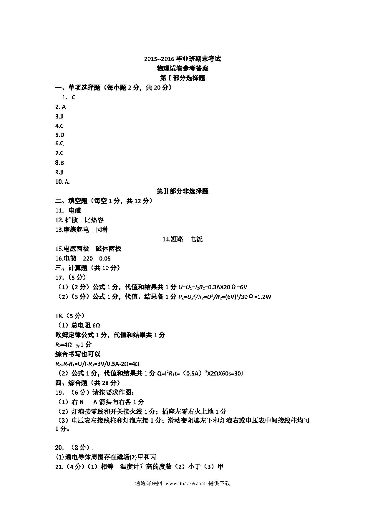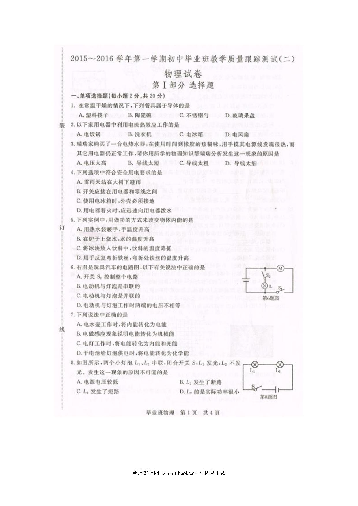 长春汽车开发区十中2015-2016第一学期九年级物理期末试卷及答案.pdf