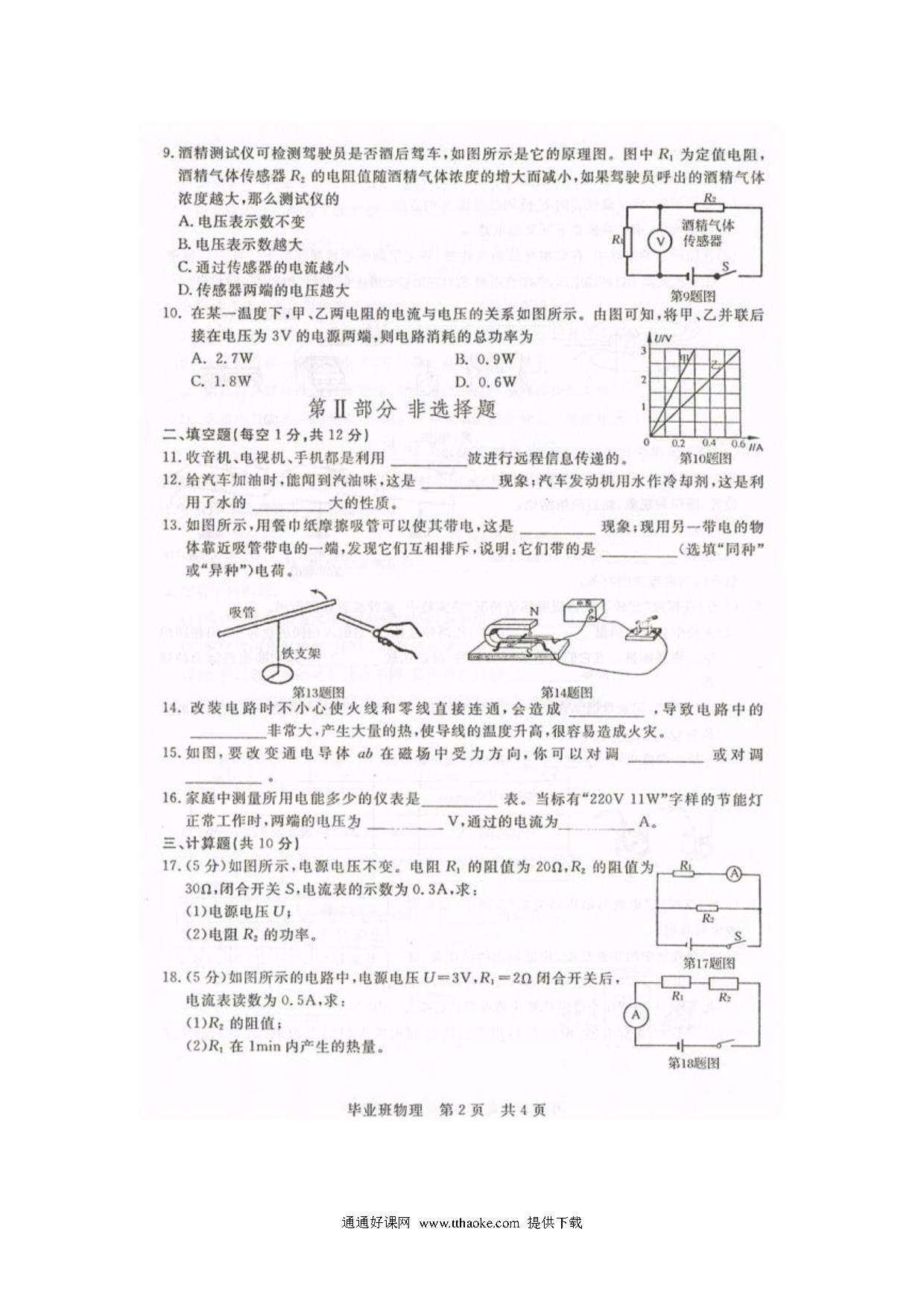 满洲里市2017-2018学年度上学期九年级物理期末试题及答案
