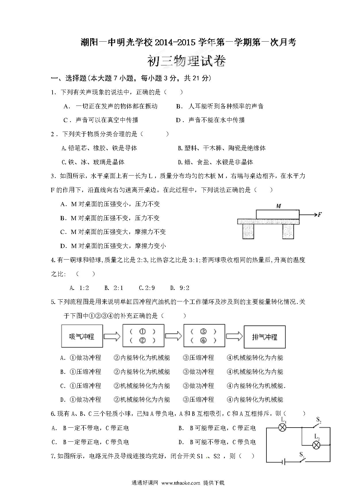 潮阳一中2015届九年级物理上学期第一次月考试题及答案.pdf