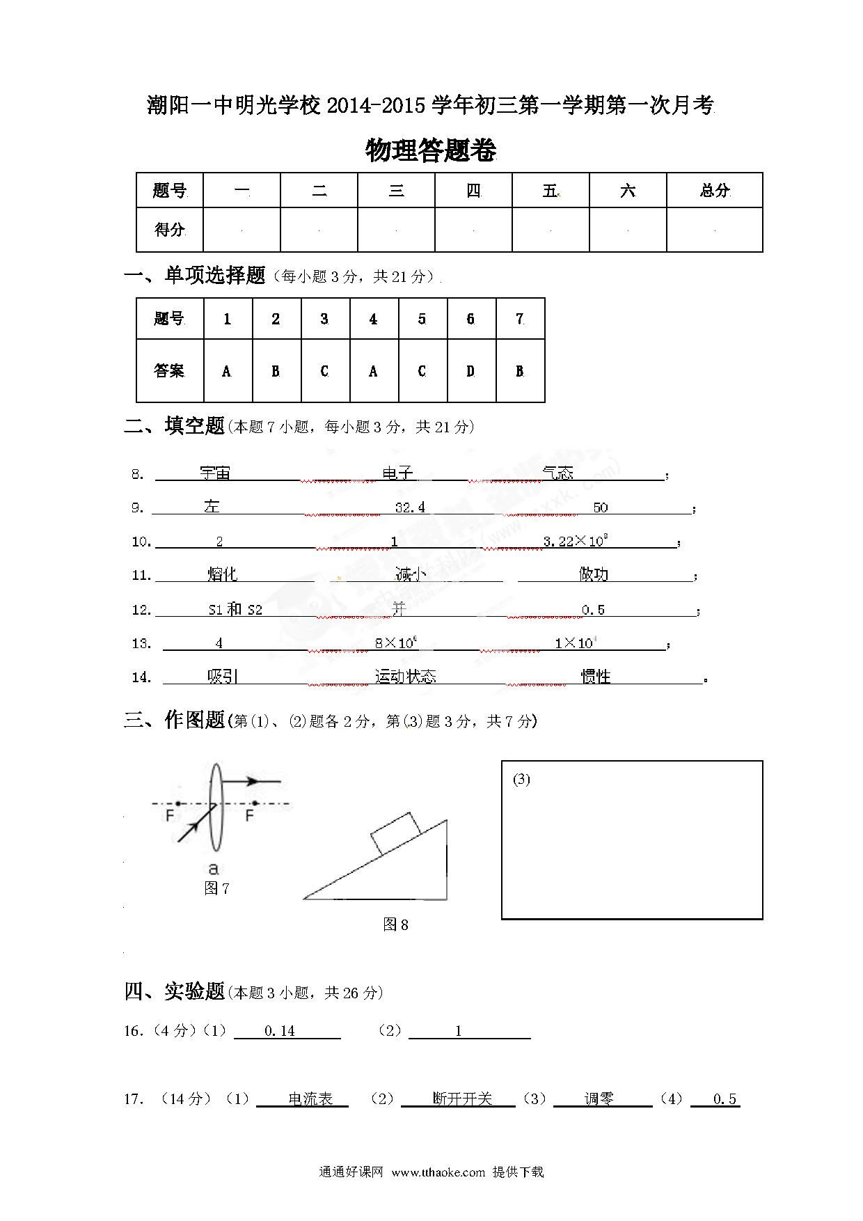 潮阳一中2015届九年级物理上学期第一次月考试题及答案