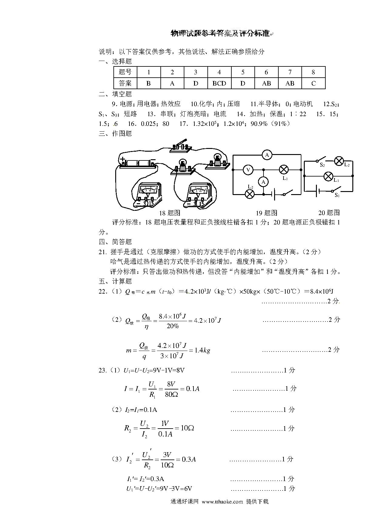 满洲里市2017-2018学年度上学期九年级物理期末试题及答案