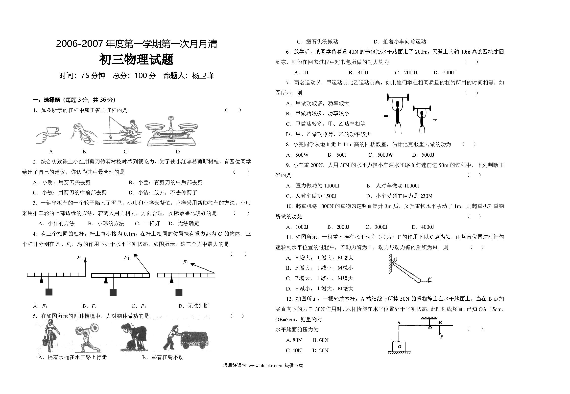 满洲里市2017-2018学年度上学期九年级物理期末试题及答案
