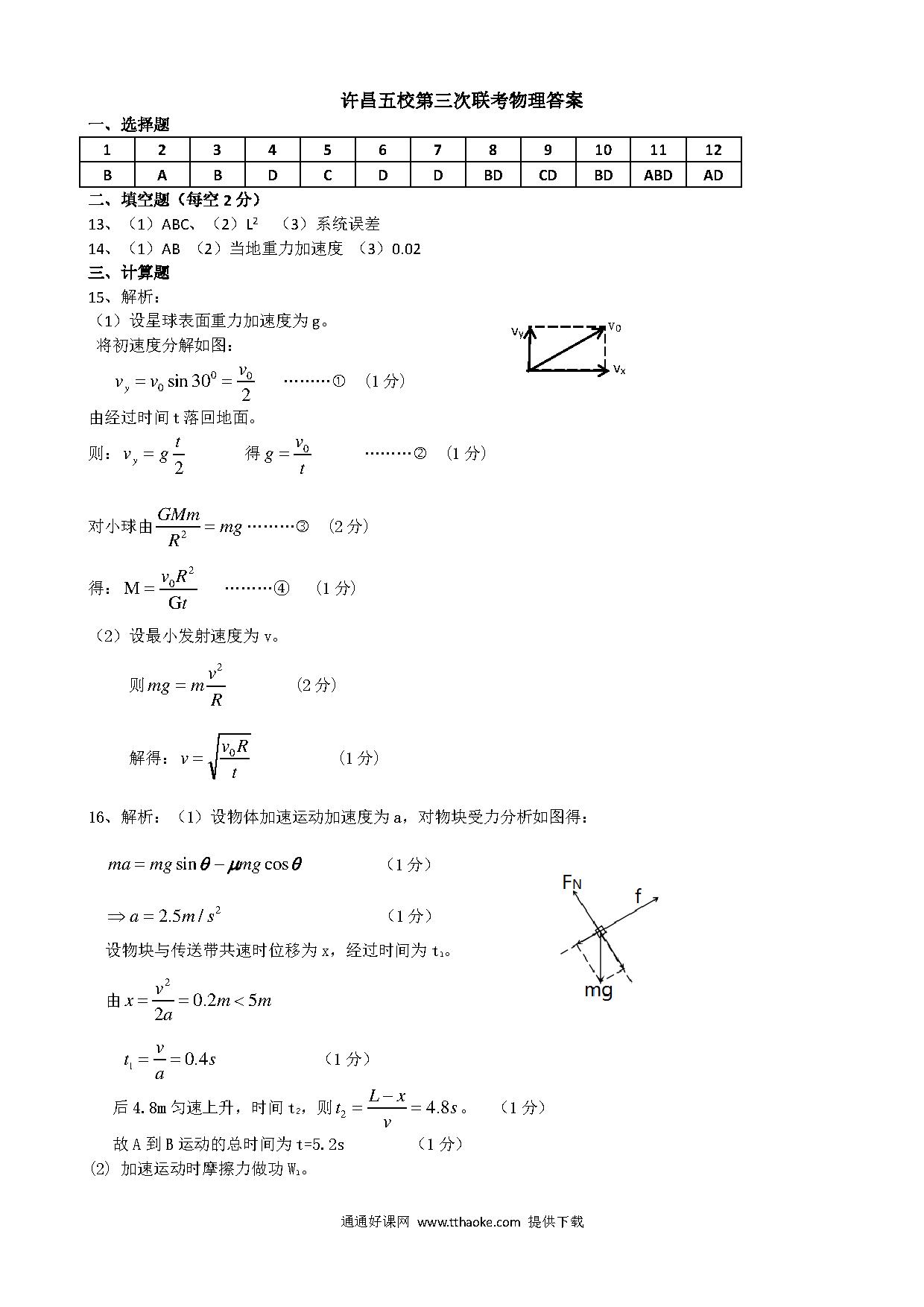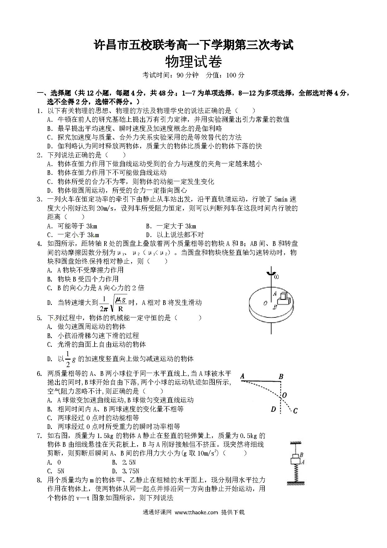 许昌五校高一5月联考物理试题及答案