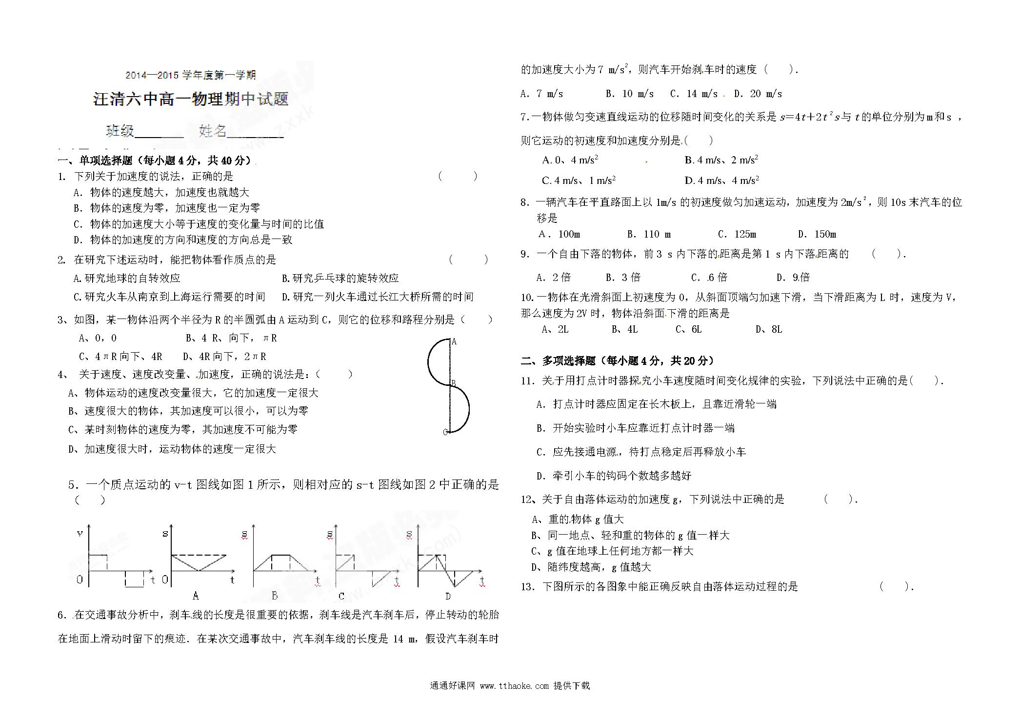 汪清六中第一学期高一期中物理试题及答案.pdf