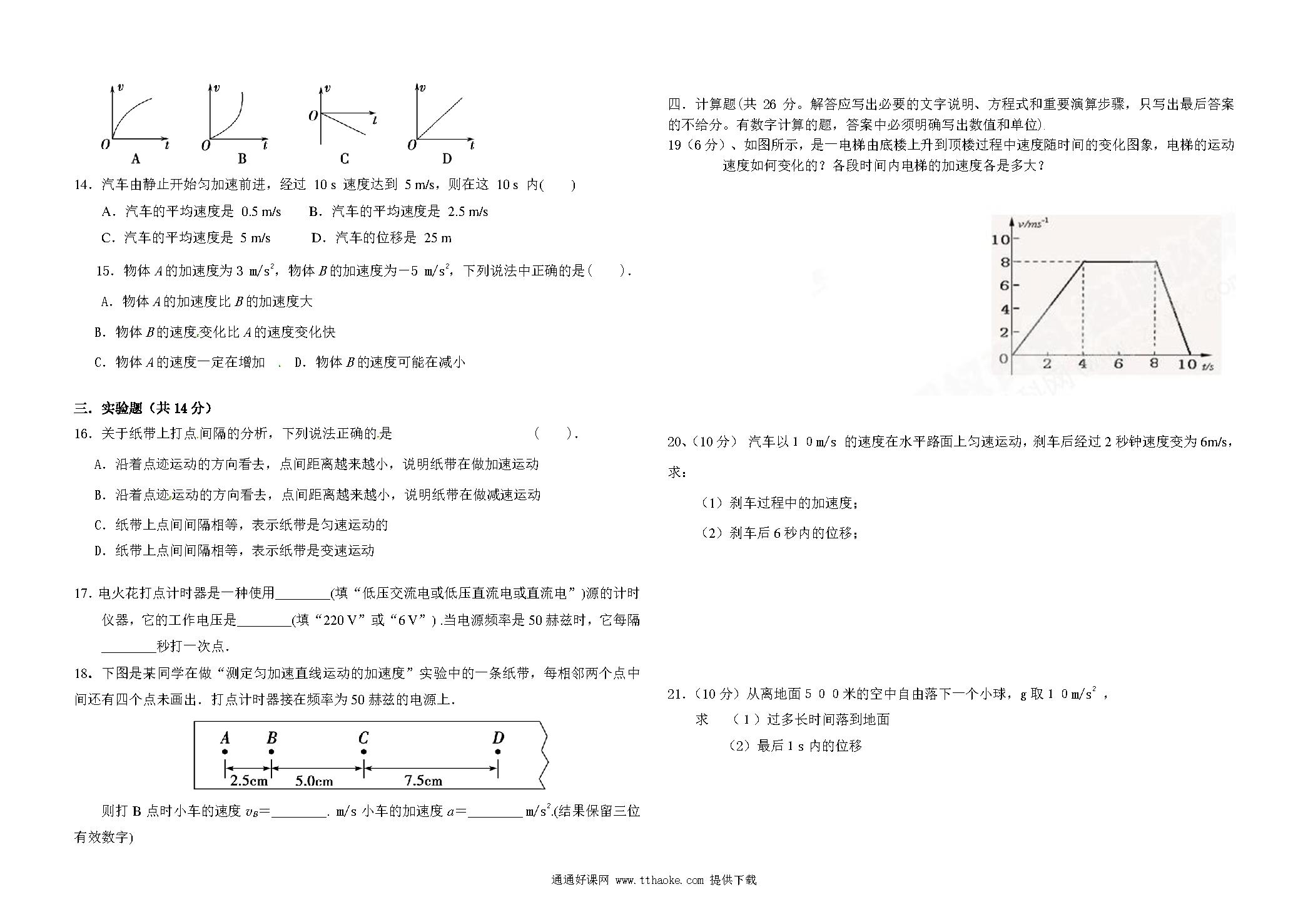 汪清六中第一学期高一期中物理试题及答案