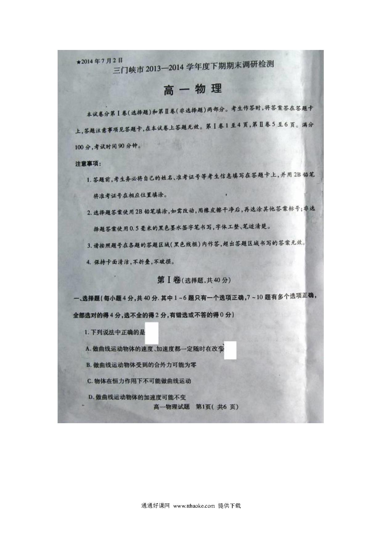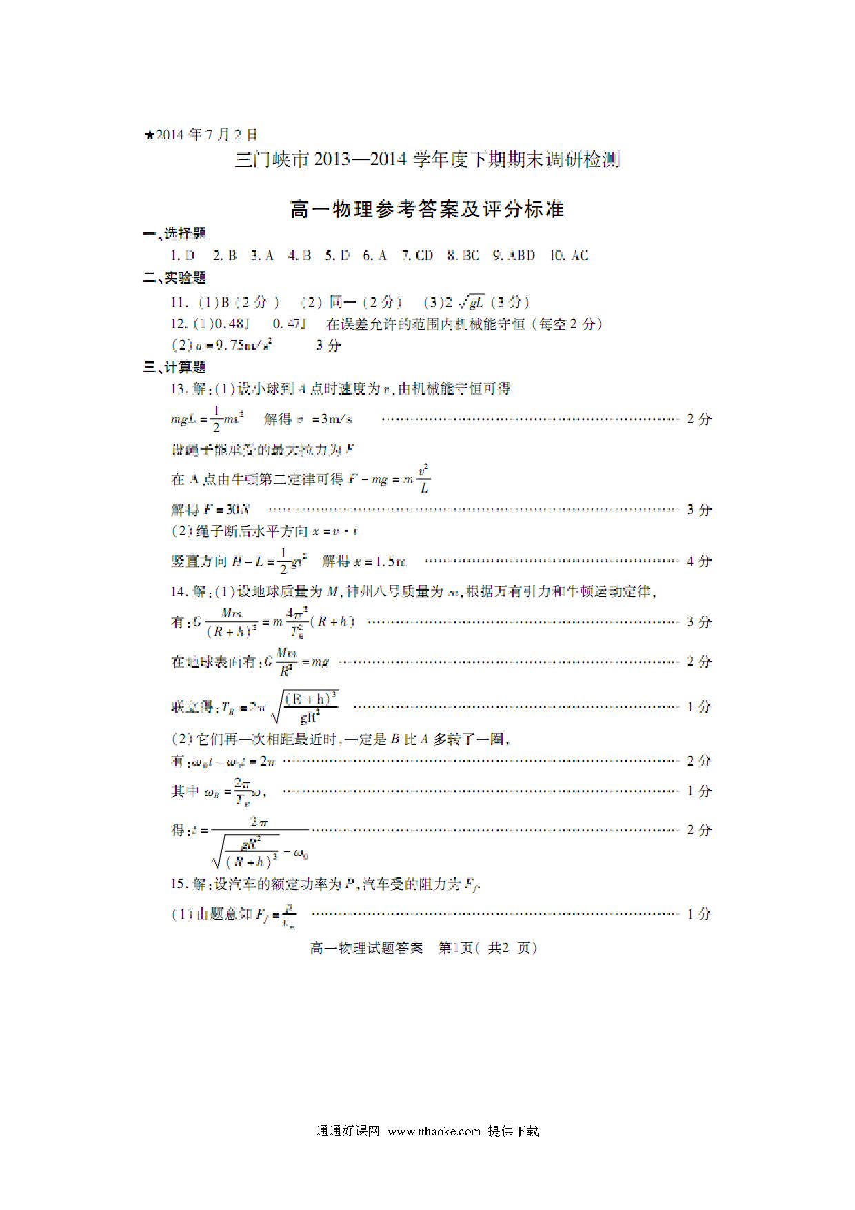 三门峡市高一下期物理期末调研试题及答案.pdf