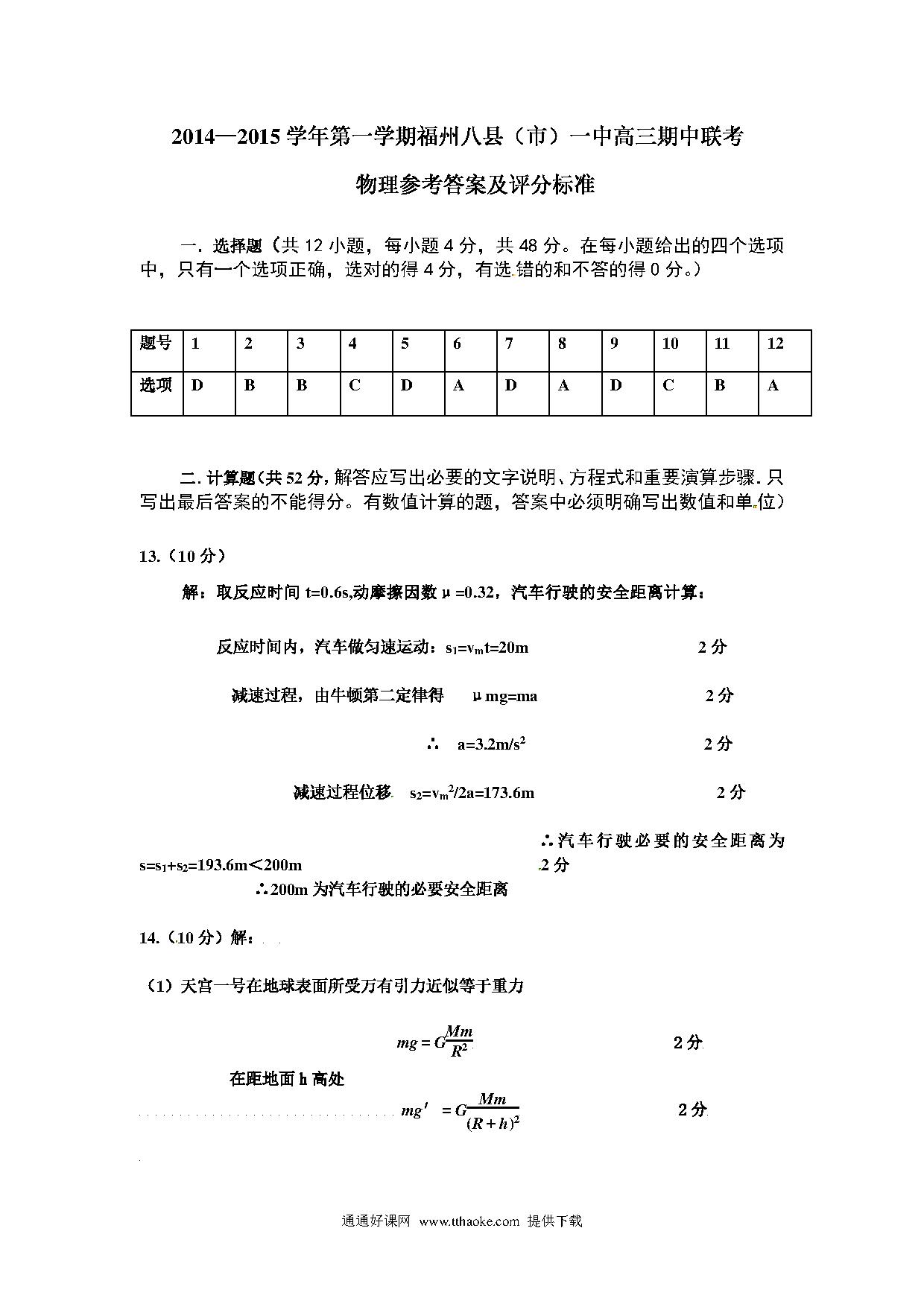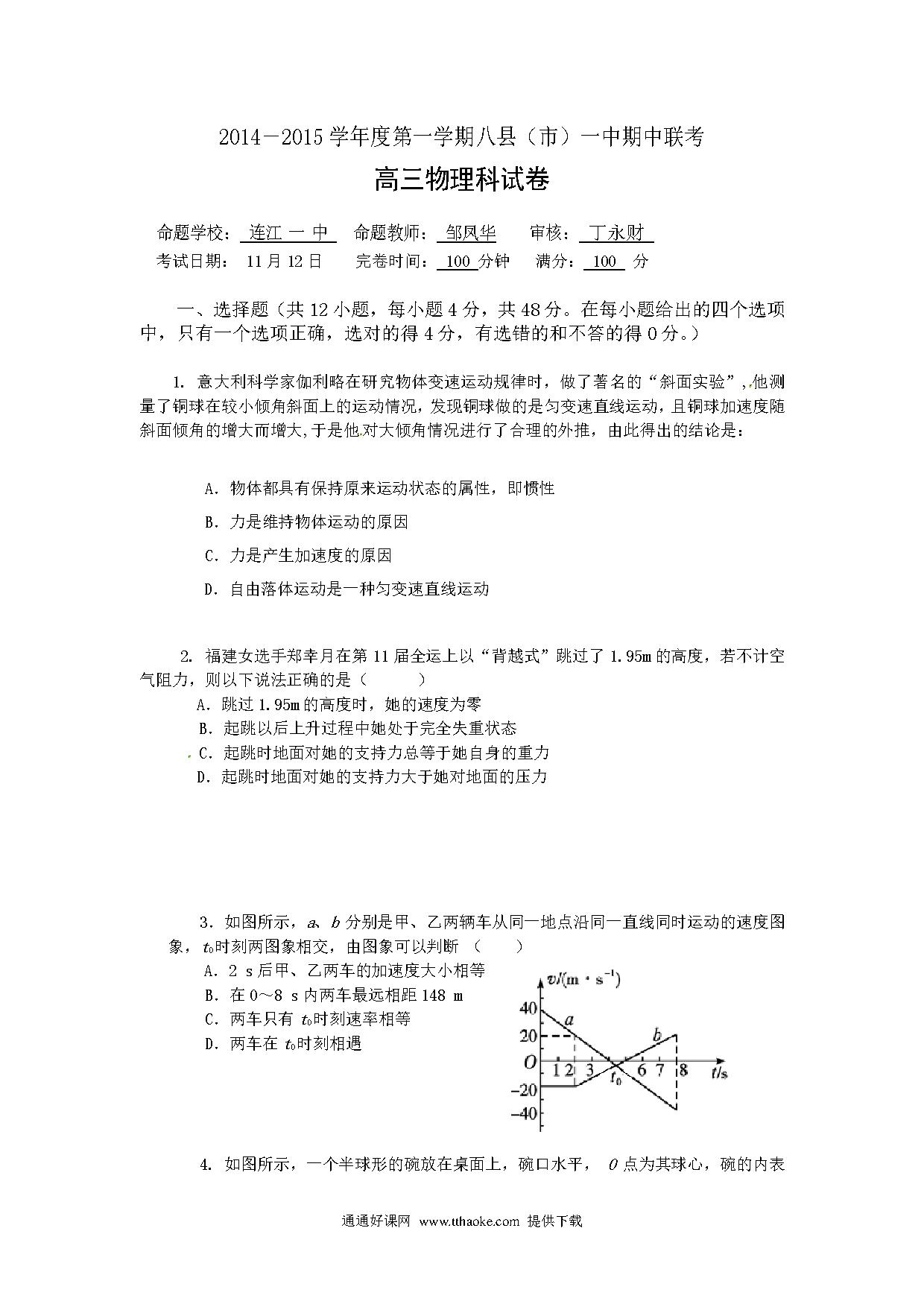 福建八县一中期中联考高三上学期物理试卷及答案.pdf