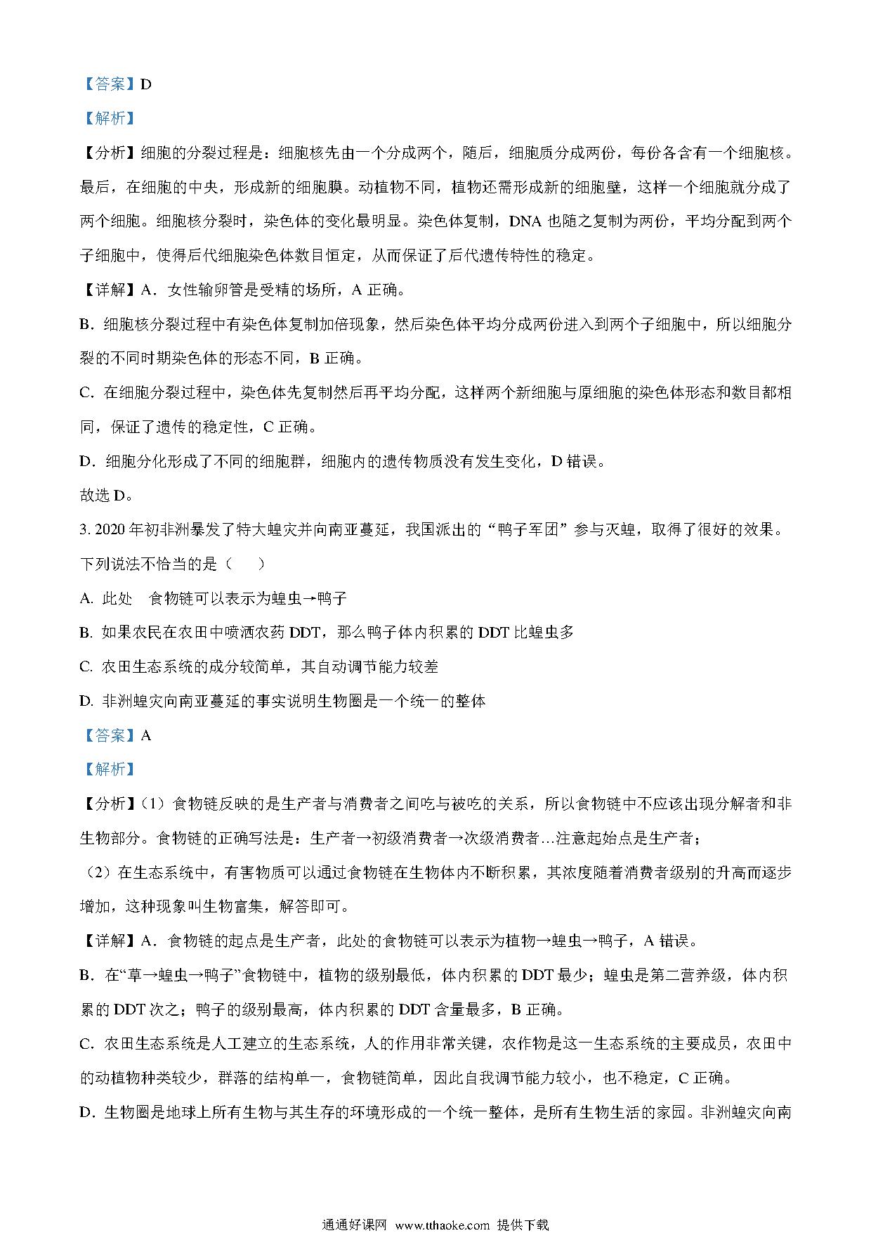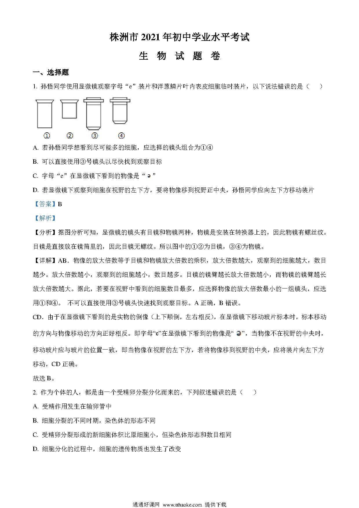 湖南省株洲市2021年中考生物试题(解析版).pdf