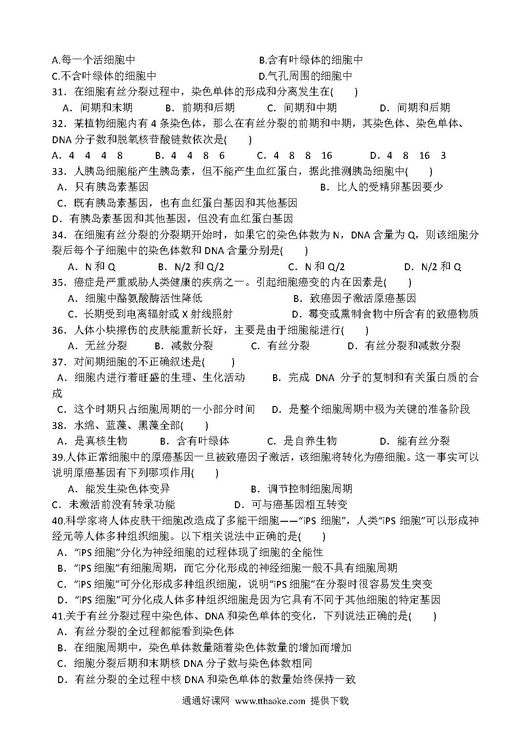 蓉城名校联盟高一上学期生物期中考试试题及答案