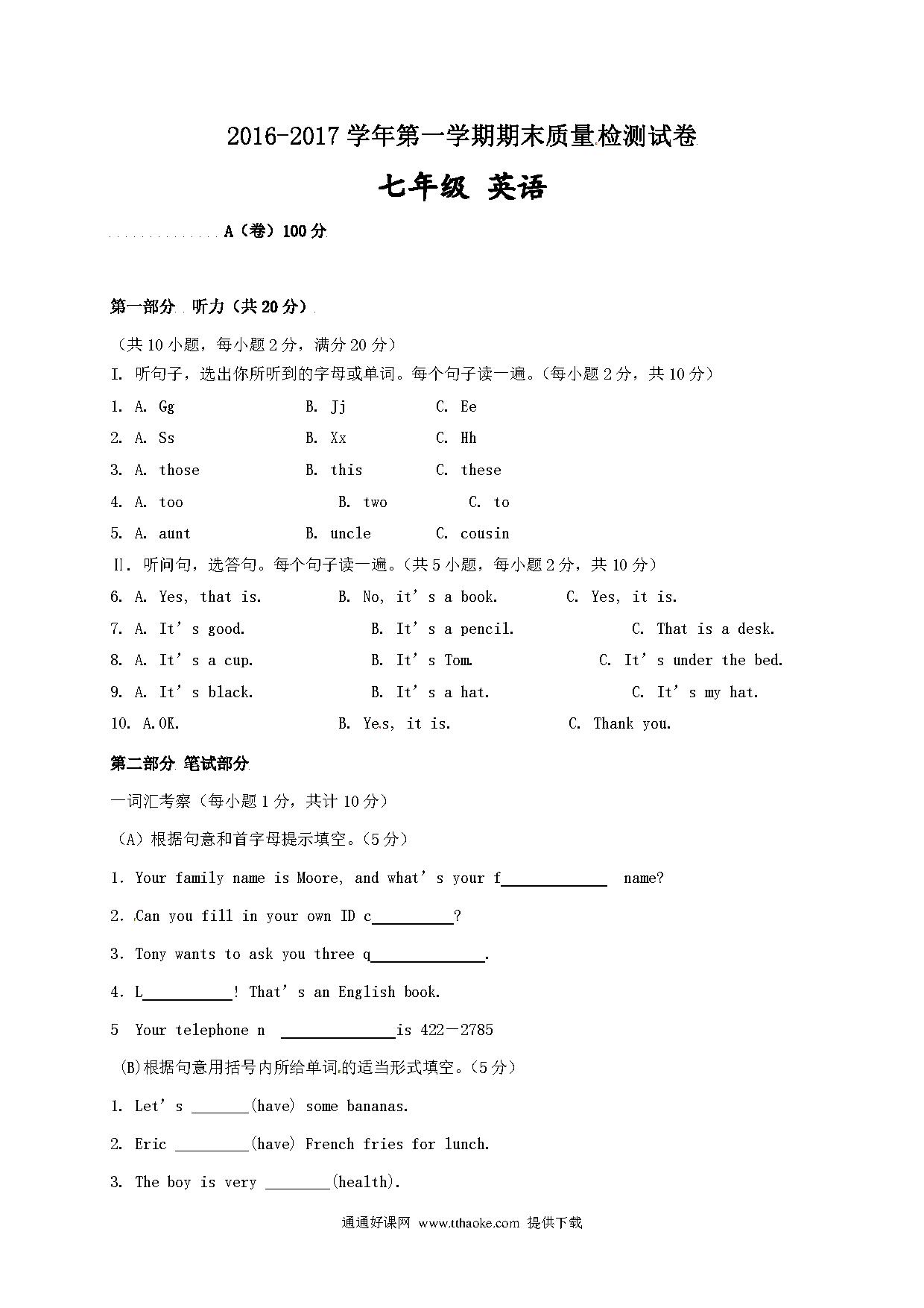 平凉市崆峒区2016-2017年第一学期七年级英语期末试卷有答案含听