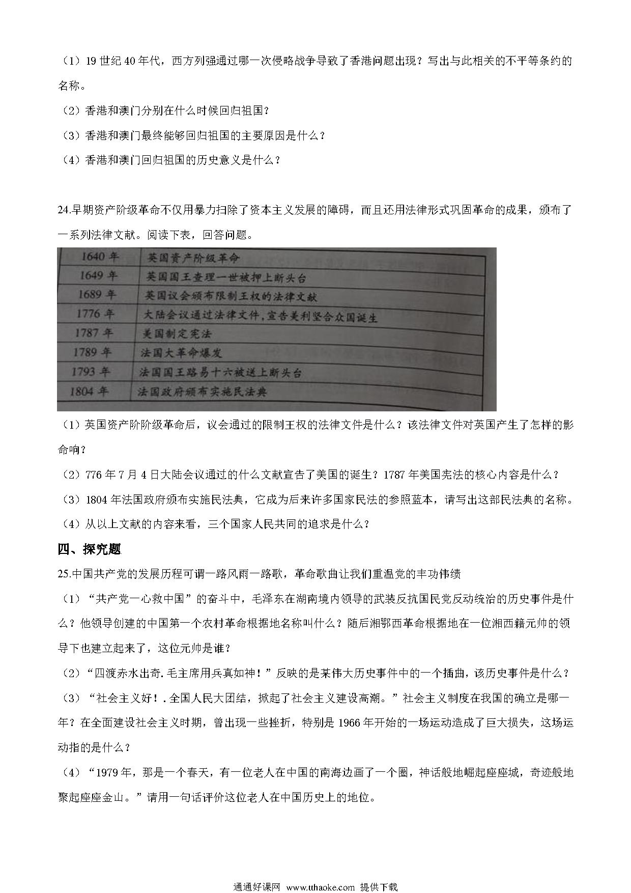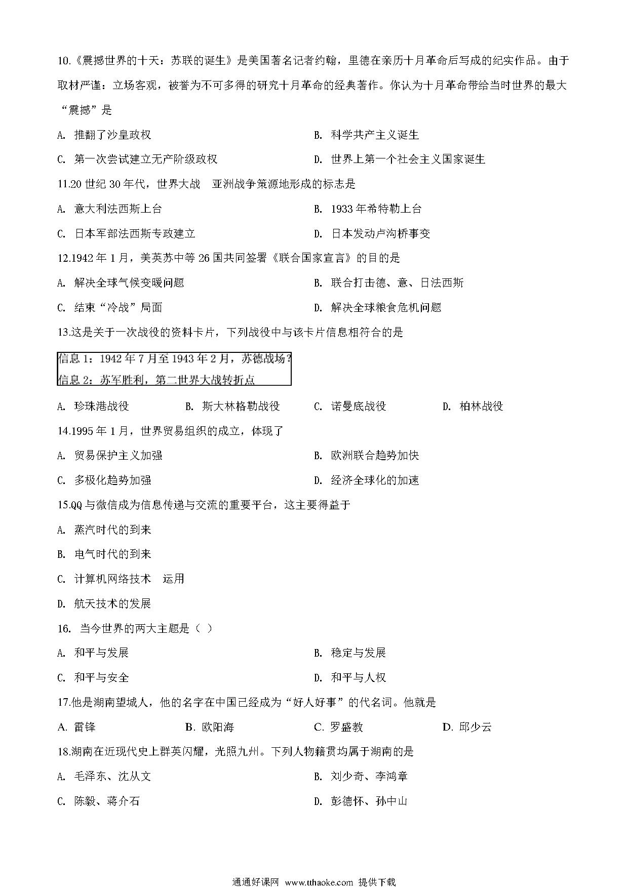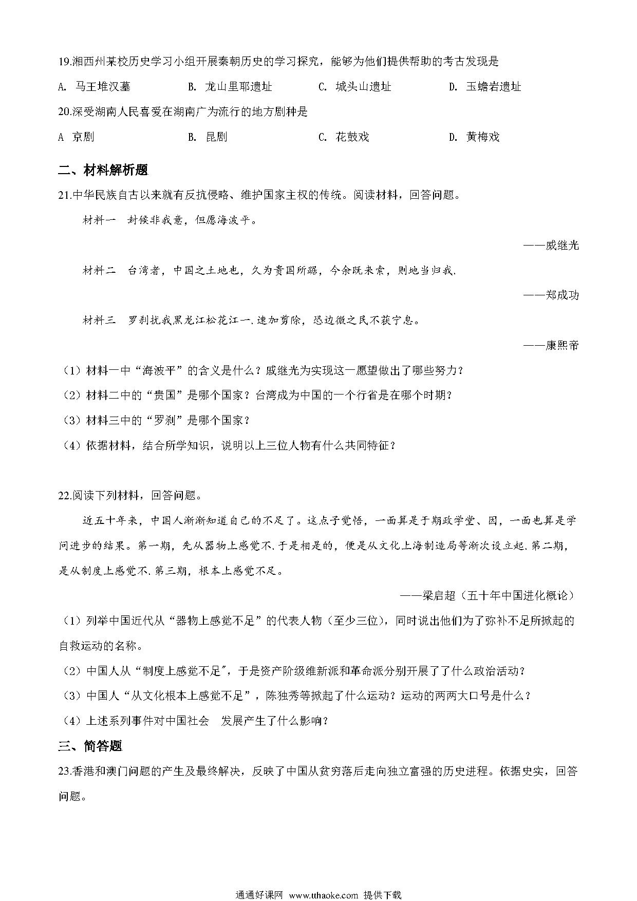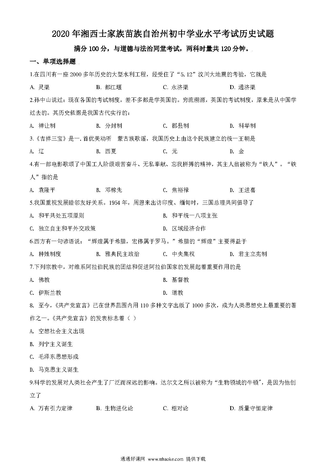 湖南省湘西2020年中考历史试题(原卷版).pdf