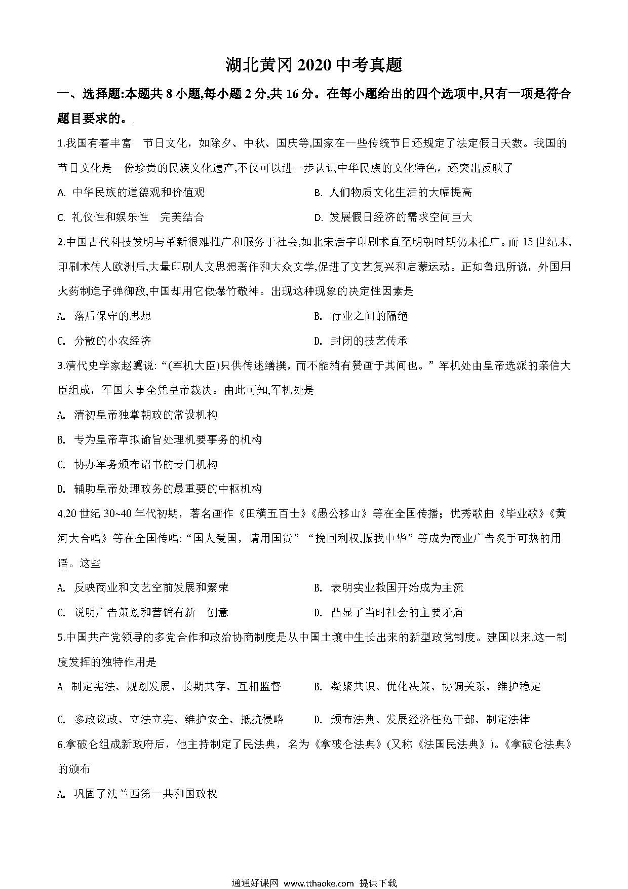 湖北省黄冈市2020年中考历史试题(原卷版)