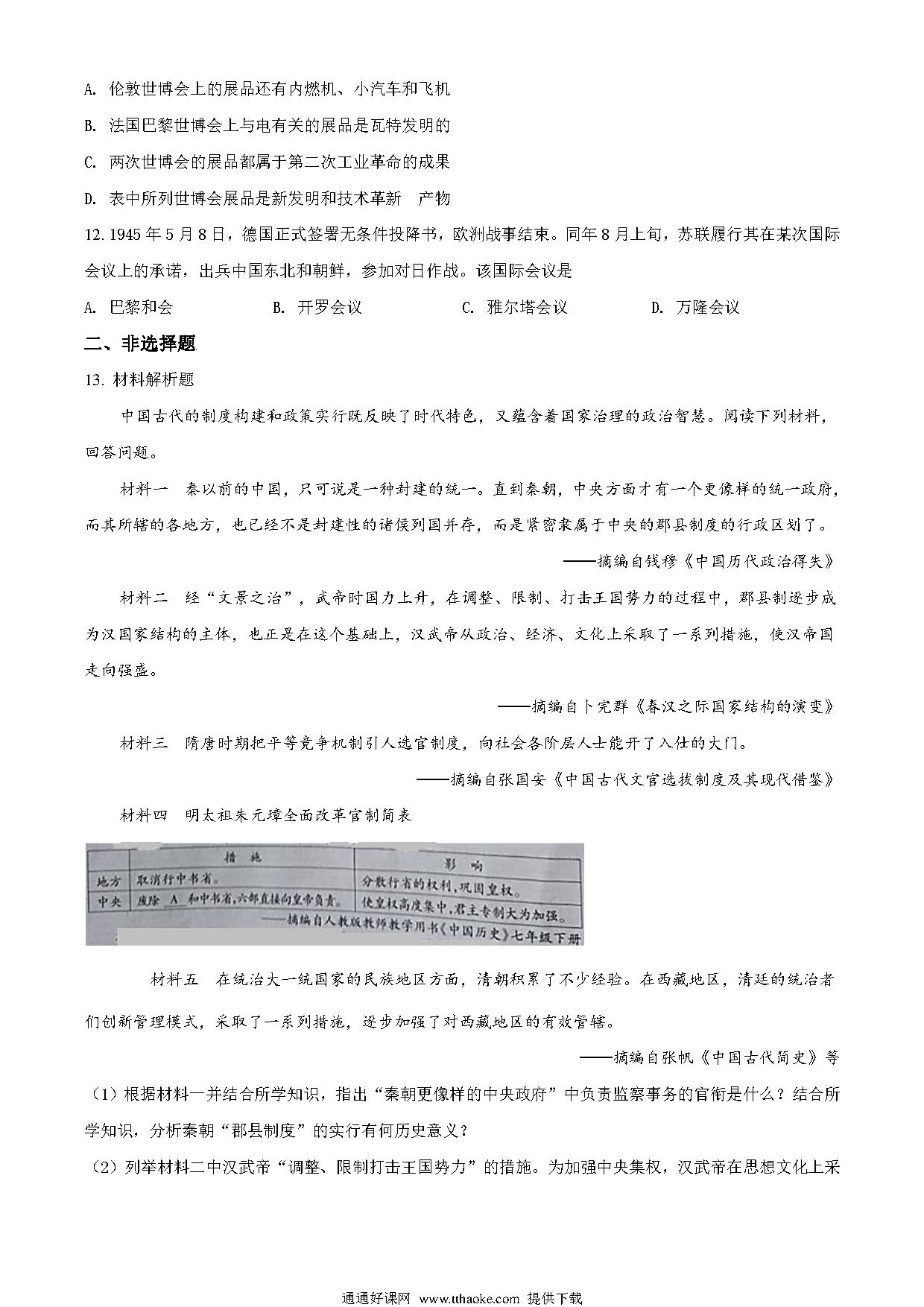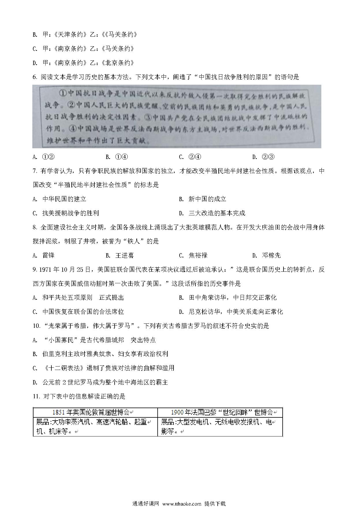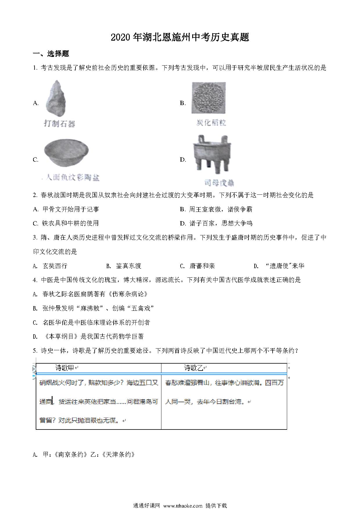 湖北省恩施州2020年中考历史试题(原卷版).pdf