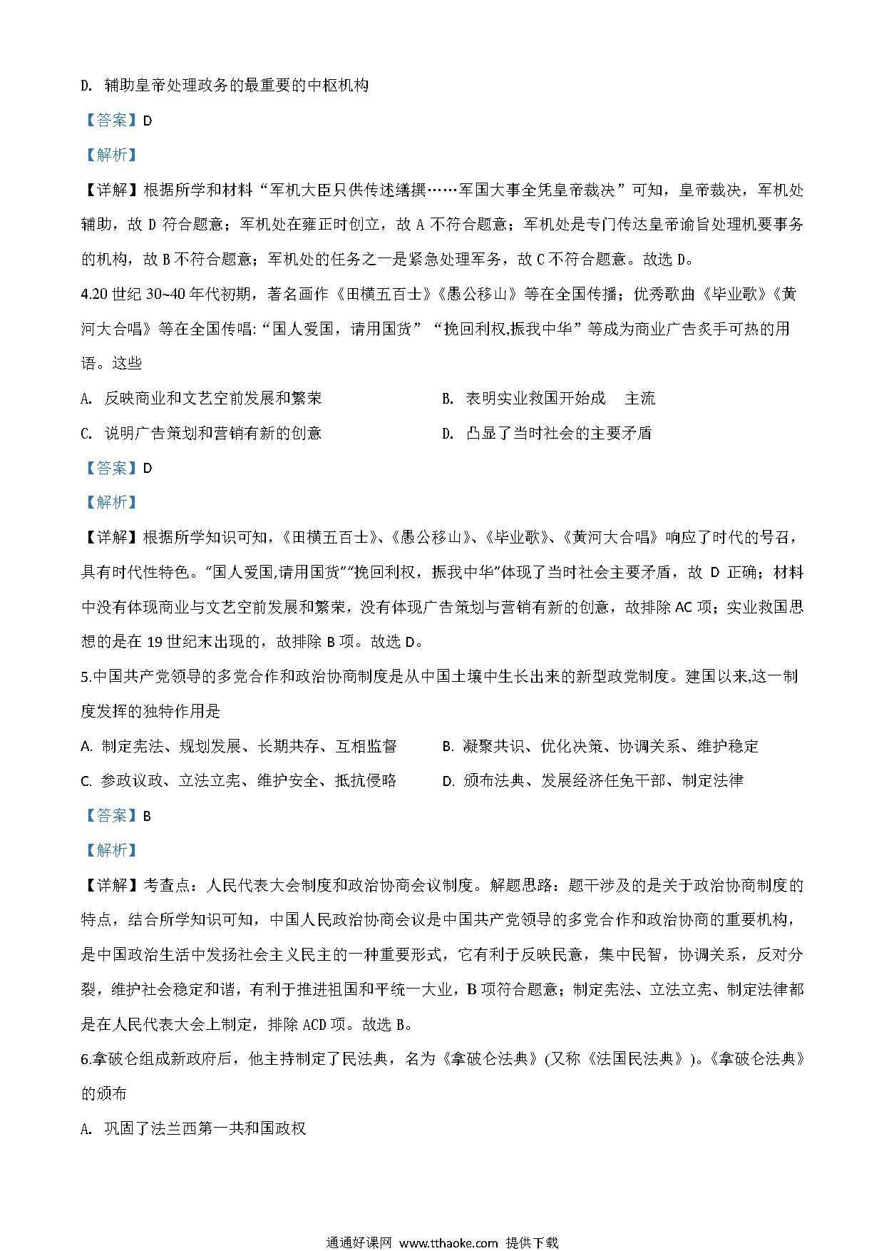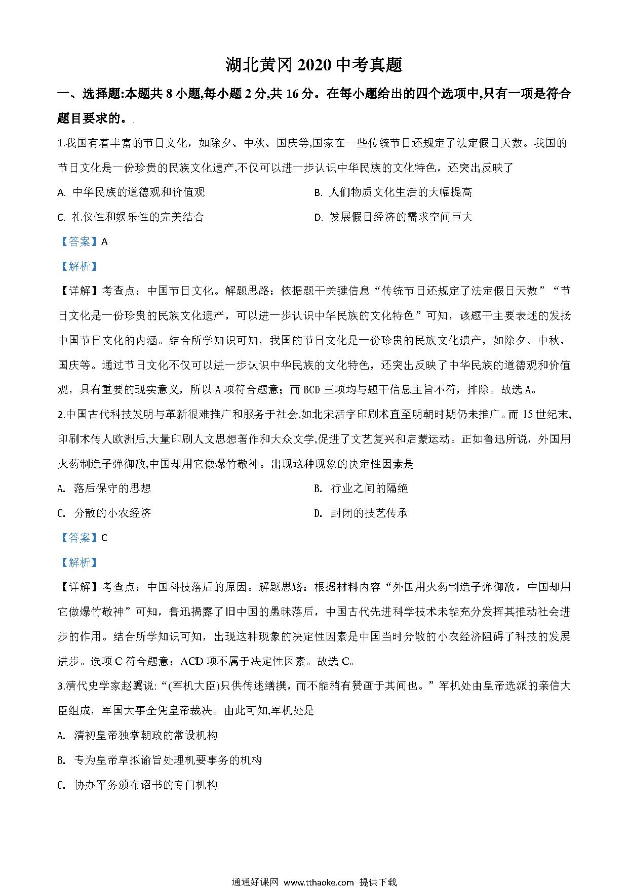 湖北省黄冈市2020年中考历史试题(解析版).pdf