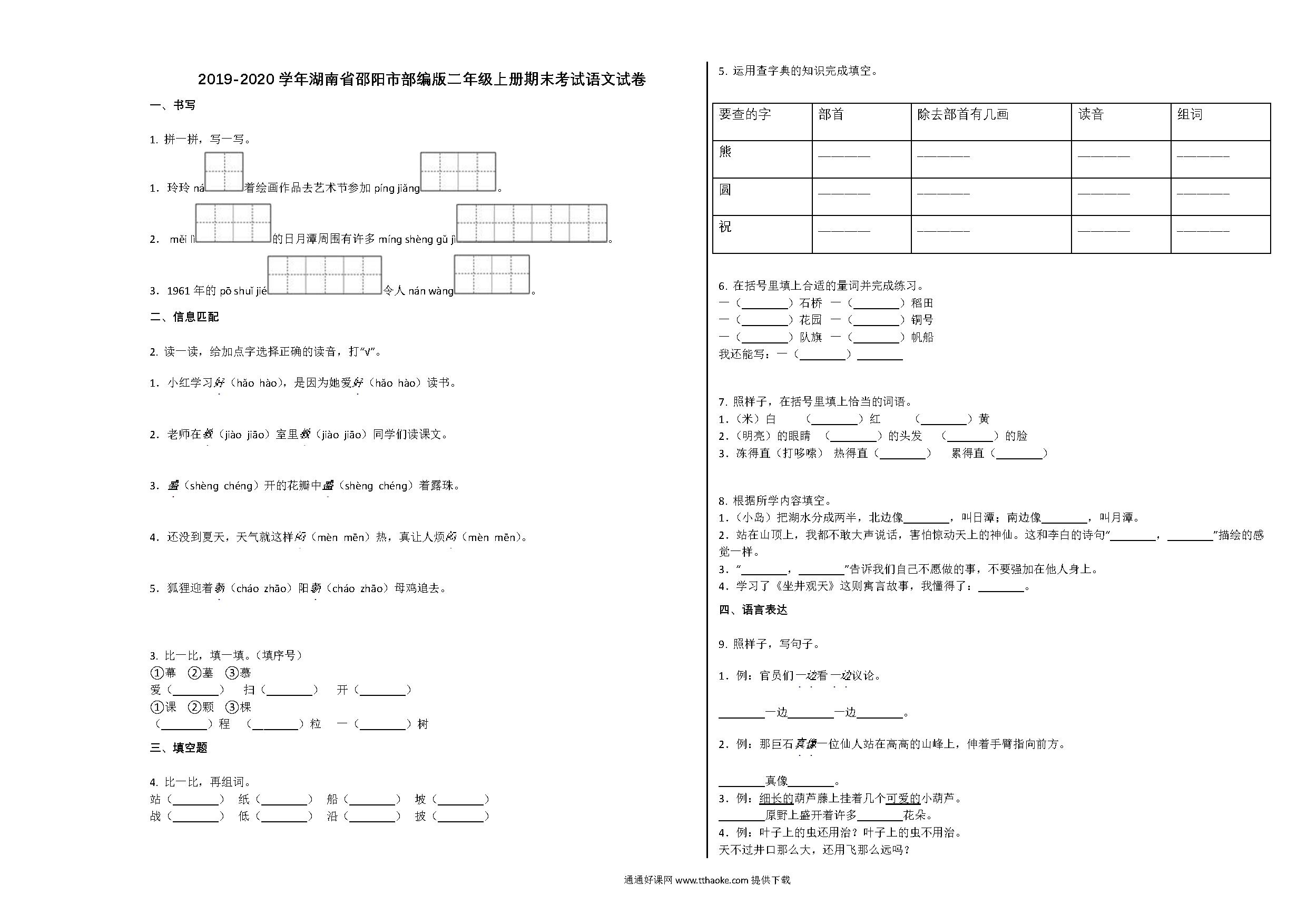 邵阳市2019-2020学年二年级语文上册期末试题.pdf