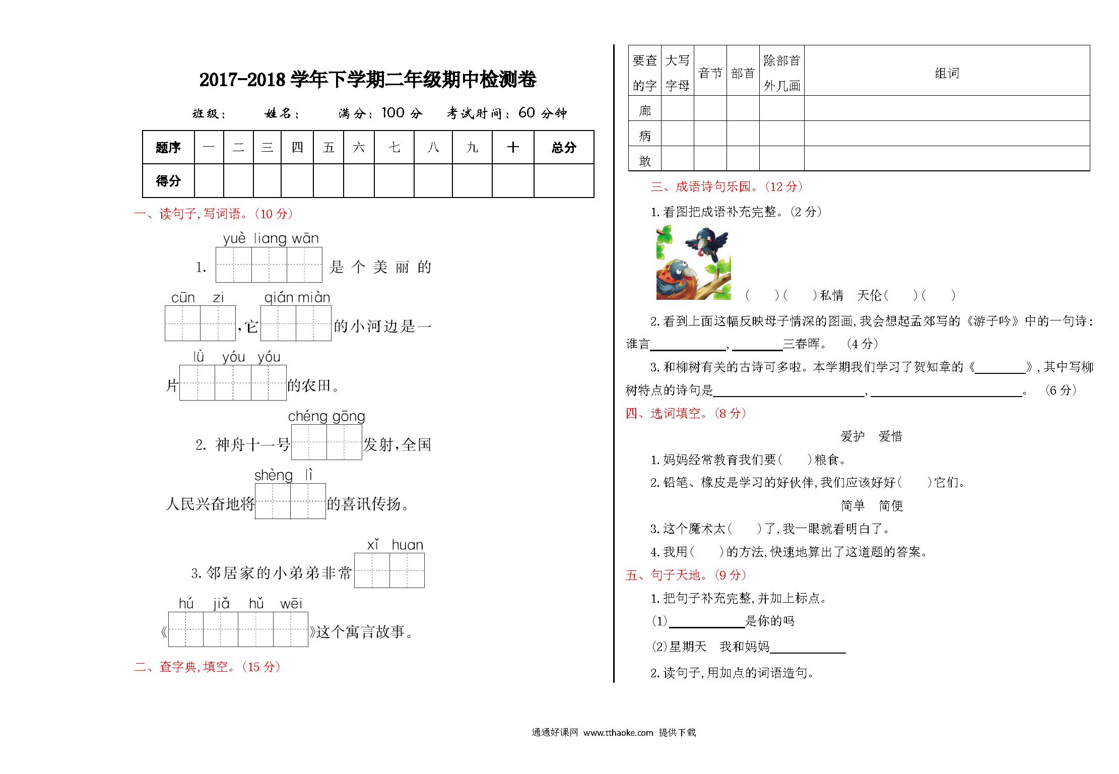 苏教版二年级语文下册期中测试卷及答案.pdf