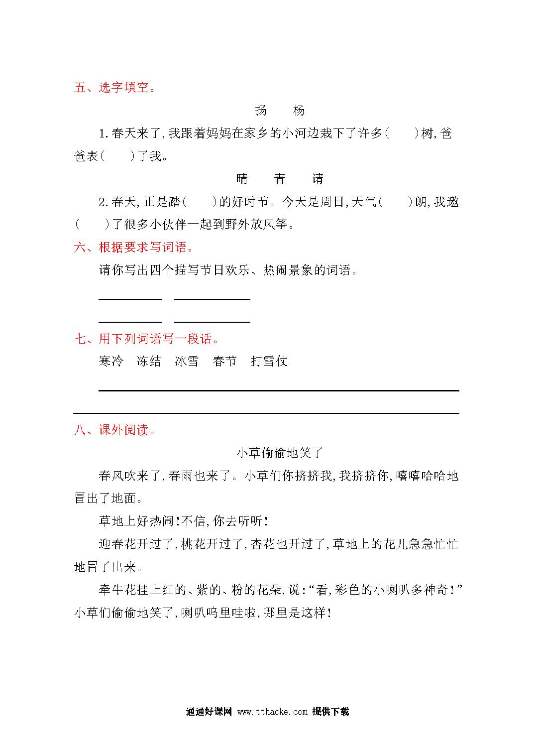苏教版二年级语文下册第一单元提升测试卷及答案.pdf