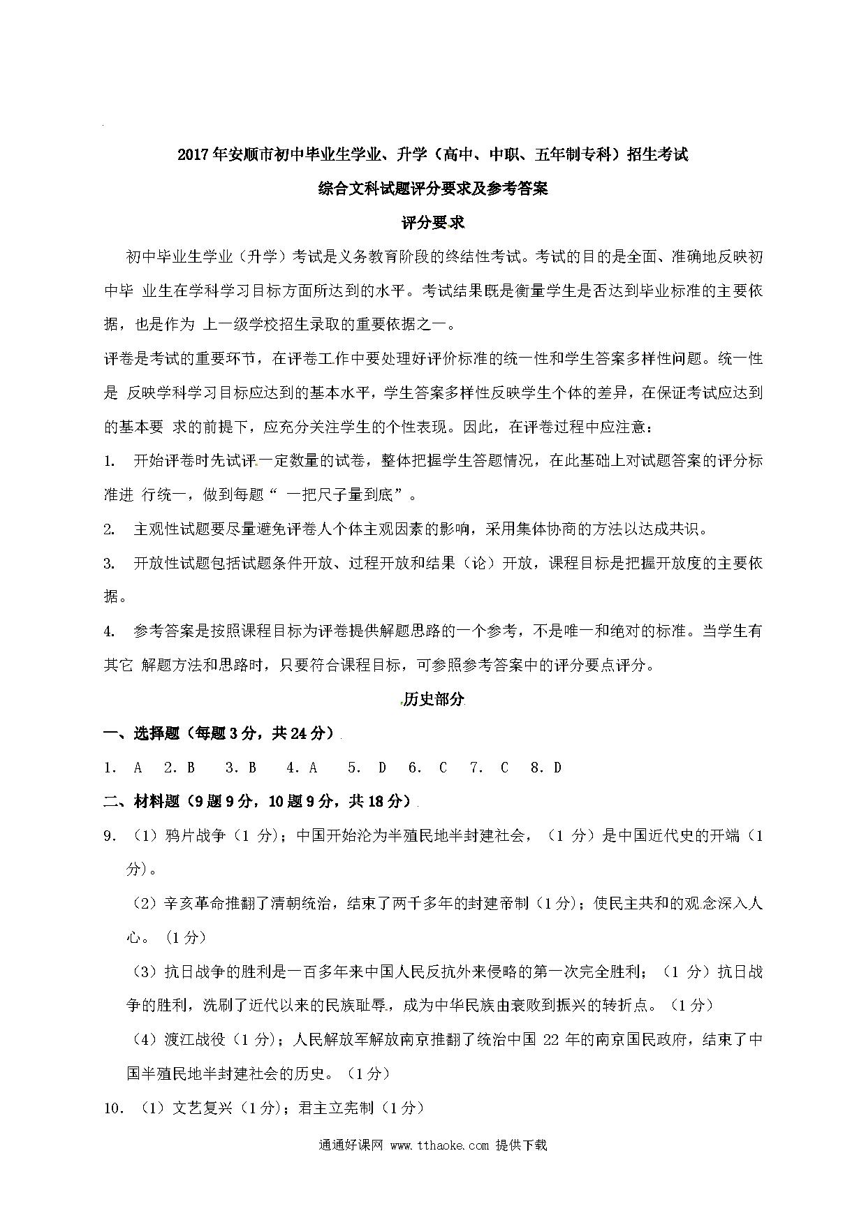 贵州省安顺市2017年中考历史真题试题(含答案).pdf
