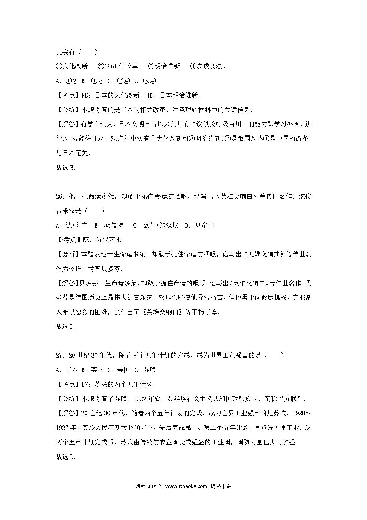 四川省自贡市2017年中考历史真题试题(含答案)